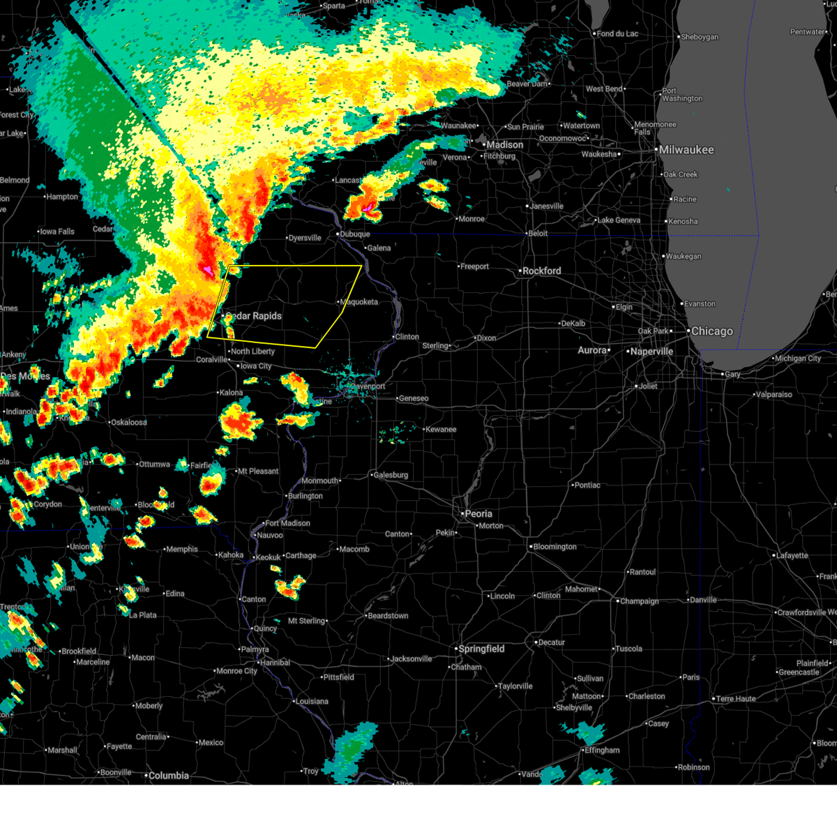 At 912 pm cst, a severe thunderstorm capable of producing a tornado was located near springville, or 9 miles northeast of cedar rapids, moving northeast at 60 mph (radar indicated rotation). Hazards include tornado and quarter size hail. Flying debris will be dangerous to those caught without shelter. mobile homes will be damaged or destroyed. damage to roofs, windows, and vehicles will occur. tree damage is likely. this dangerous storm will be near, stone city around 920 pm cst. anamosa and morley around 925 pm cst. langworthy around 930 pm cst. monticello around 935 pm cst. Other locations impacted by this tornadic thunderstorm include marion airport, wapsipinicon state park, matsell bridge natural area, central park and paralta.
