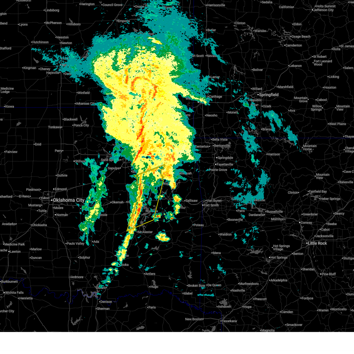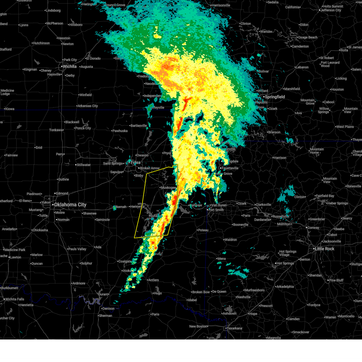 At 429 pm cst, a severe thunderstorm capable of producing a tornado was located 4 miles south of checotah, moving northeast at 45 mph (radar indicated rotation). Hazards include tornado. Flying debris will be dangerous to those caught without shelter. mobile homes will be damaged or destroyed. damage to roofs, windows, and vehicles will occur. tree damage is likely. Locations in or near the path include, muskogee, checotah, warner, oktaha, rentiesville, lake eufaula state park, keefeton, summit, onapa, this includes interstate 40 in oklahoma between mile markers 259 and 280.