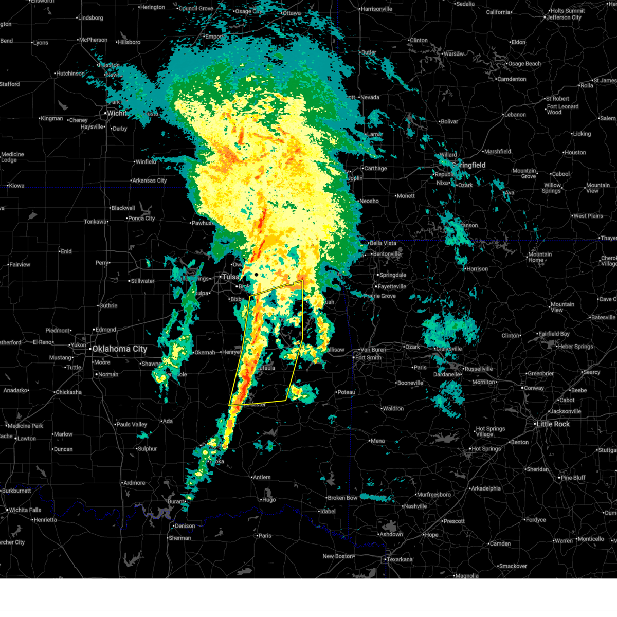 Svrtsa the national weather service in tulsa has issued a * severe thunderstorm warning for, mcintosh county in southeastern oklahoma, southern wagoner county in northeastern oklahoma, west central cherokee county in east central oklahoma, northwestern pittsburg county in southeastern oklahoma, central okmulgee county in northeastern oklahoma, northwestern muskogee county in east central oklahoma, southeastern okfuskee county in east central oklahoma, * until 130 pm cdt. * at 1233 pm cdt, a severe thunderstorm was located 5 miles east of dustin, moving northeast at 65 mph (radar indicated). Hazards include 60 mph wind gusts and quarter size hail. Hail damage to vehicles is expected. expect wind damage to roofs, siding, and trees. Locations in or near the path include, raiford, weleetka, dewar, oktaha, summit, vivian, hanna, fort gibson, muskogee, okay, pierce, schulter, stonebluff, eram, checotah, haskell, lake eufaula state park, morris, porter, grayson, this includes interstate 40 in oklahoma between mile markers 232 and 266.