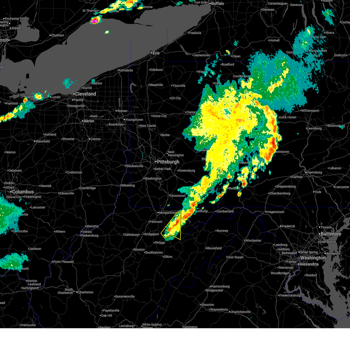 At 720 pm edt, a severe thunderstorm capable of producing a tornado was located over monongah, or near fairmont, moving east at 60 mph (radar indicated rotation). Hazards include tornado. Flying debris will be dangerous to those caught without shelter. mobile homes will be damaged or destroyed. damage to roofs, windows, and vehicles will occur. tree damage is likely. this dangerous storm will be near, fairmont around 725 pm edt. winfield around 730 pm edt. brookhaven around 740 pm edt. kingwood around 750 pm edt. other locations impacted by this tornadic thunderstorm include rivesville, valley point, booth, everettville, laurel run, brandonville, grant town, albright, baxter and reedsville. this includes the following highways, interstate 68 in west virginia between mile markers 1 and 6, and between mile markers 16 and 25. interstate 79 in west virginia between mile markers 130 and 151. Please report severe weather by calling 412-262-1988, posting to the nws pittsburgh facebook page, or using twitter @nwspittsburgh.