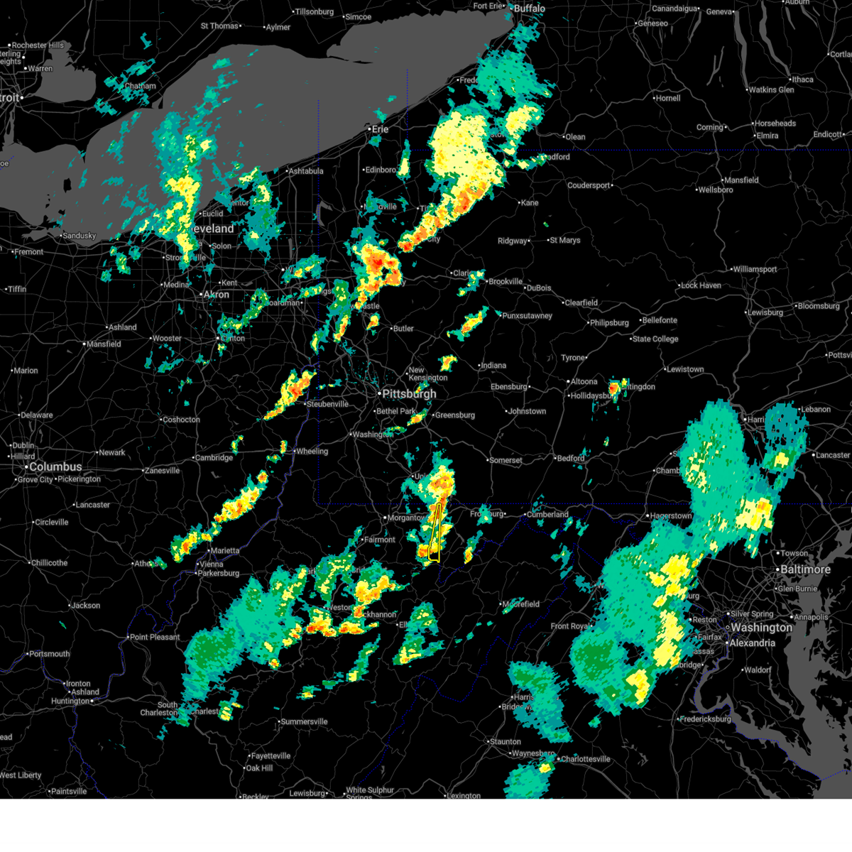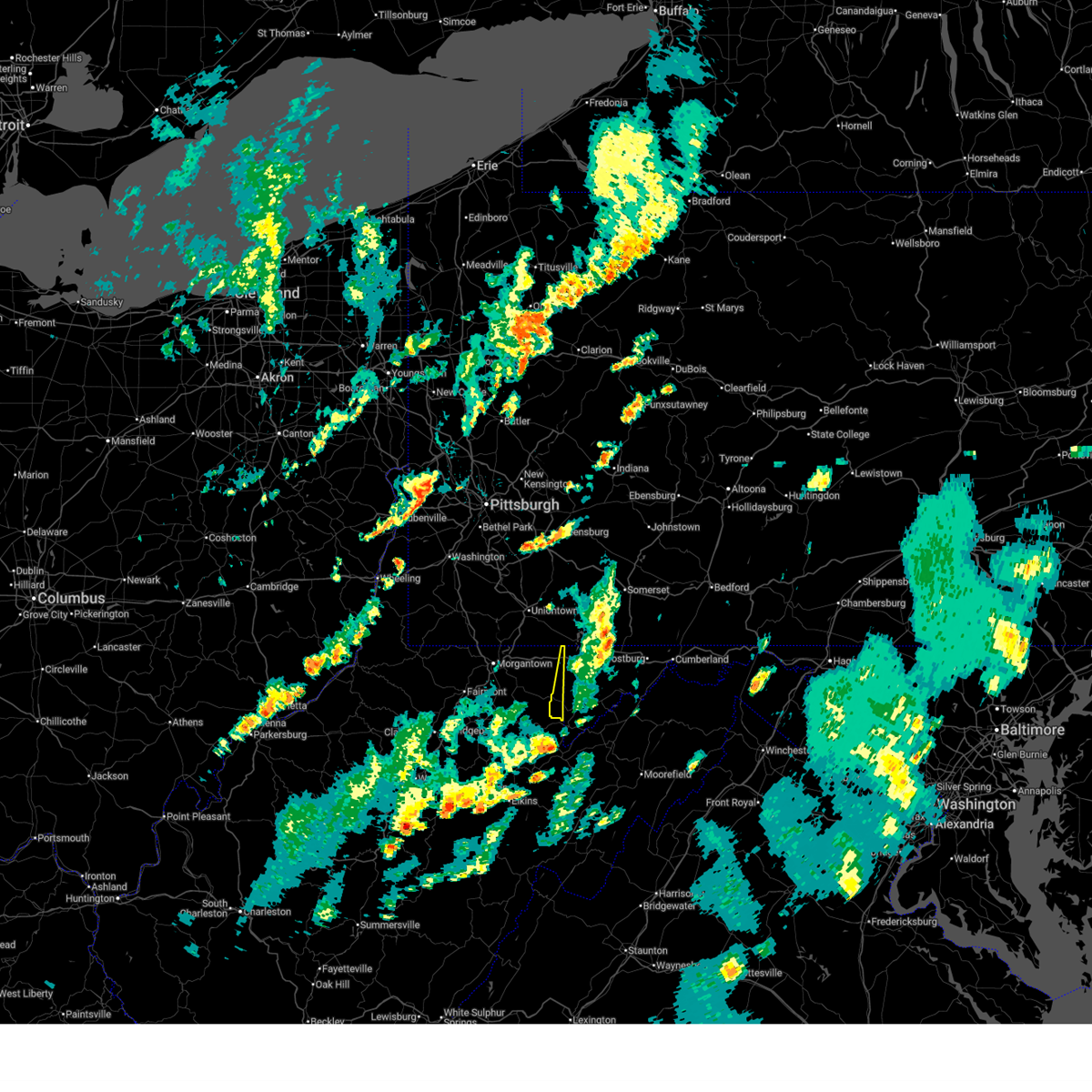 At 630 pm edt, severe thunderstorms were located along a line extending from near uniontown to near grafton, moving east at 60 mph (radar indicated). Hazards include 60 mph wind gusts. Expect damage to trees and power lines, resulting in some power outages. Locations impacted include, morgantown, fairmont, uniontown, westover, kingwood, star city, terra alta, rowlesburg, pleasant valley, winfield, farmington, barrackville, point marion, monongah, granville, newburg, brookhaven, fairchance, rivesville, and smithfield.