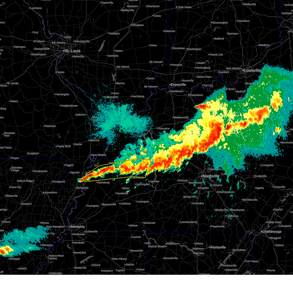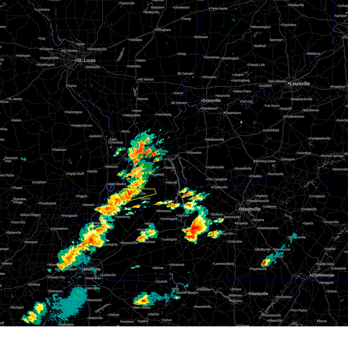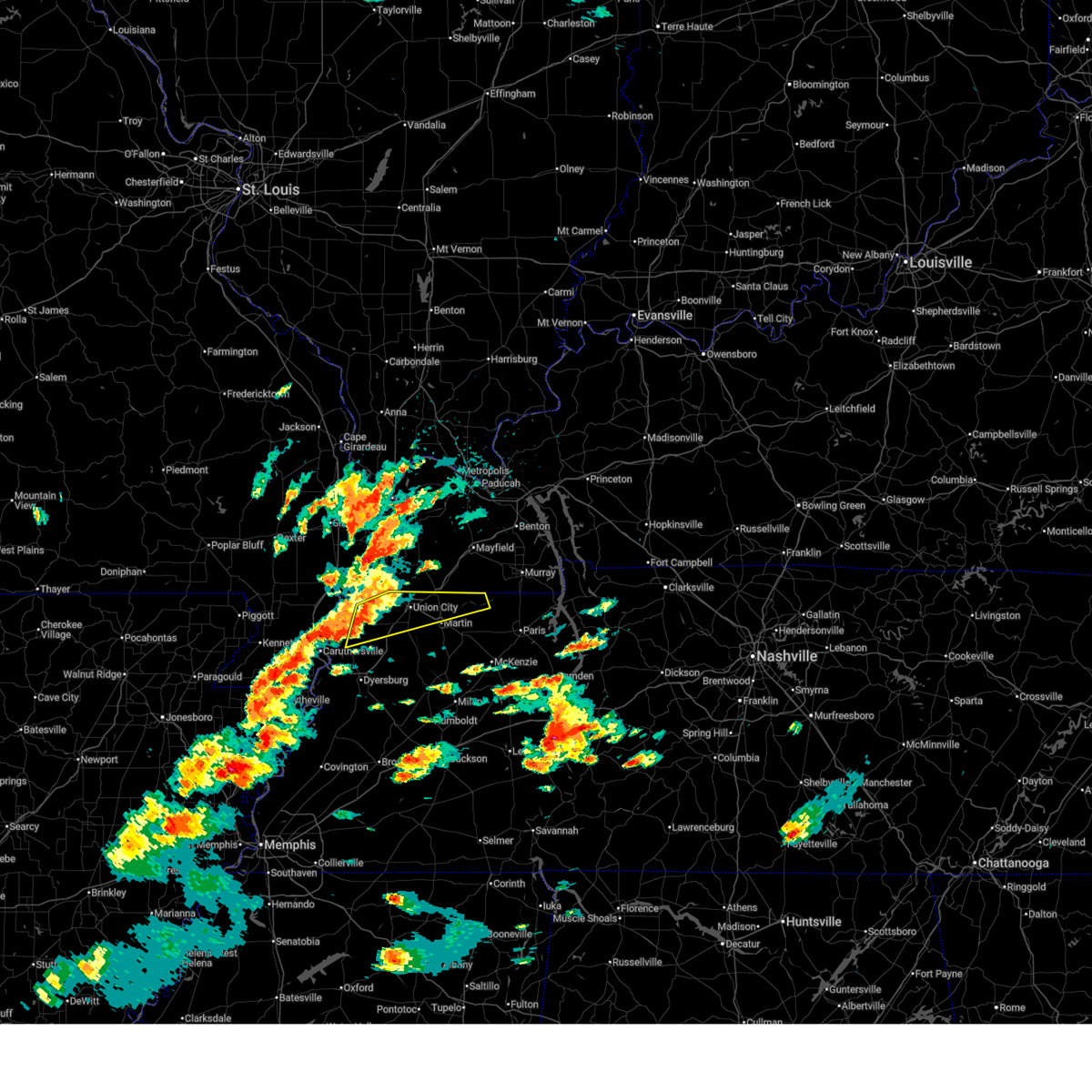 At 227 am cdt, a severe thunderstorm producing a tornado was located near heloise, or 11 miles southeast of steele, moving east at 60 mph (radar indicated rotation). Hazards include tornado. Flying debris will be dangerous to those caught without shelter. mobile homes will be damaged or destroyed. damage to roofs, windows, and vehicles will occur. tree damage is likely. this dangerous storm will be near, unionville around 240 am cdt. bradleytown around 245 am cdt. dyersburg around 250 am cdt. newbern around 255 am cdt. dyer around 305 am cdt. kenton and rutherford around 310 am cdt. Other locations impacted by this tornadic thunderstorm include cat corner, grizzard, fowlkes, lapata, bonicord, central, tyler, locust grove, jenkinsville and maxey.