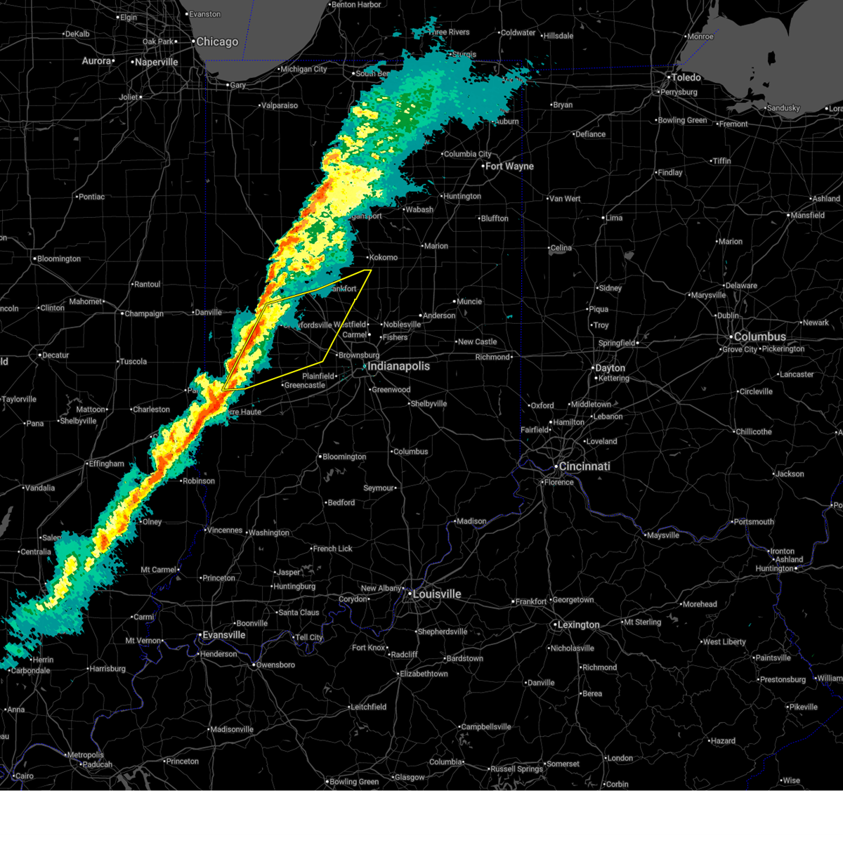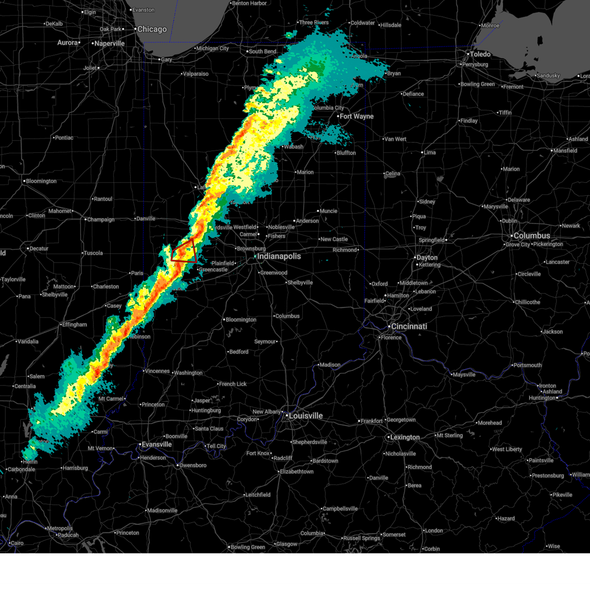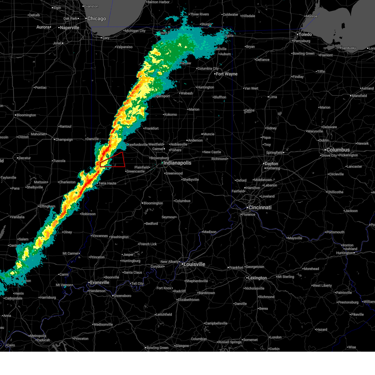 At 259 pm edt, severe thunderstorms were located along a line extending from 9 miles northeast of veedersburg to 7 miles south of terre haute, moving east at 80 mph (radar indicated). Hazards include 70 mph wind gusts. Expect considerable tree damage. damage is likely to mobile homes, roofs, and outbuildings. severe thunderstorms will be near, new richmond around 305 pm edt. linden and center point around 310 pm edt. darlington, colfax, bowling green and patricksburg around 315 pm edt. other locations in the path of these severe thunderstorms include thorntown, cagles mill lake, spencer, gosport, devore, quincy, mccormicks creek state park, paragon, stinesville and martinsville. this includes the following highways, interstate 65 between mile markers 128 and 147. interstate 70 between mile markers 21 and 68. interstate 74 between mile markers 28 and 69. thunderstorm damage threat, considerable hail threat, radar indicated max hail size, <. 75 in wind threat, radar indicated max wind gust, 70 mph.