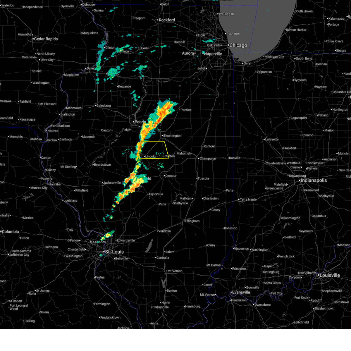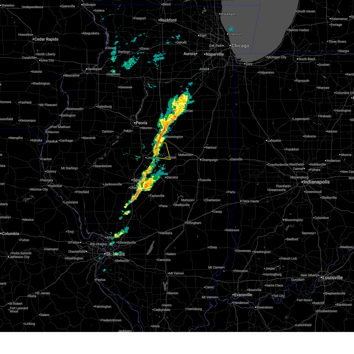 At 1220 am cdt, severe thunderstorms were located along a line extending from near secor to near stanford to near lincoln, moving east at 50 mph (radar indicated). Hazards include 60 mph wind gusts and nickel size hail. Expect damage to roofs, siding, and trees. these severe storms will be near, el paso around 1225 am cdt. other locations in the path of these severe thunderstorms include bloomington, normal, gridley, downs, waynesville, lexington, kenney, clinton, chenoa, wapella and cooksville. this includes the following highways, interstate 155 between mile markers 0 and 12. interstate 39 between mile markers 0 and 16. interstate 55 between mile markers 118 and 186. interstate 74 between mile markers 110 and 148. hail threat, radar indicated max hail size, 0. 88 in wind threat, radar indicated max wind gust, 60 mph.
