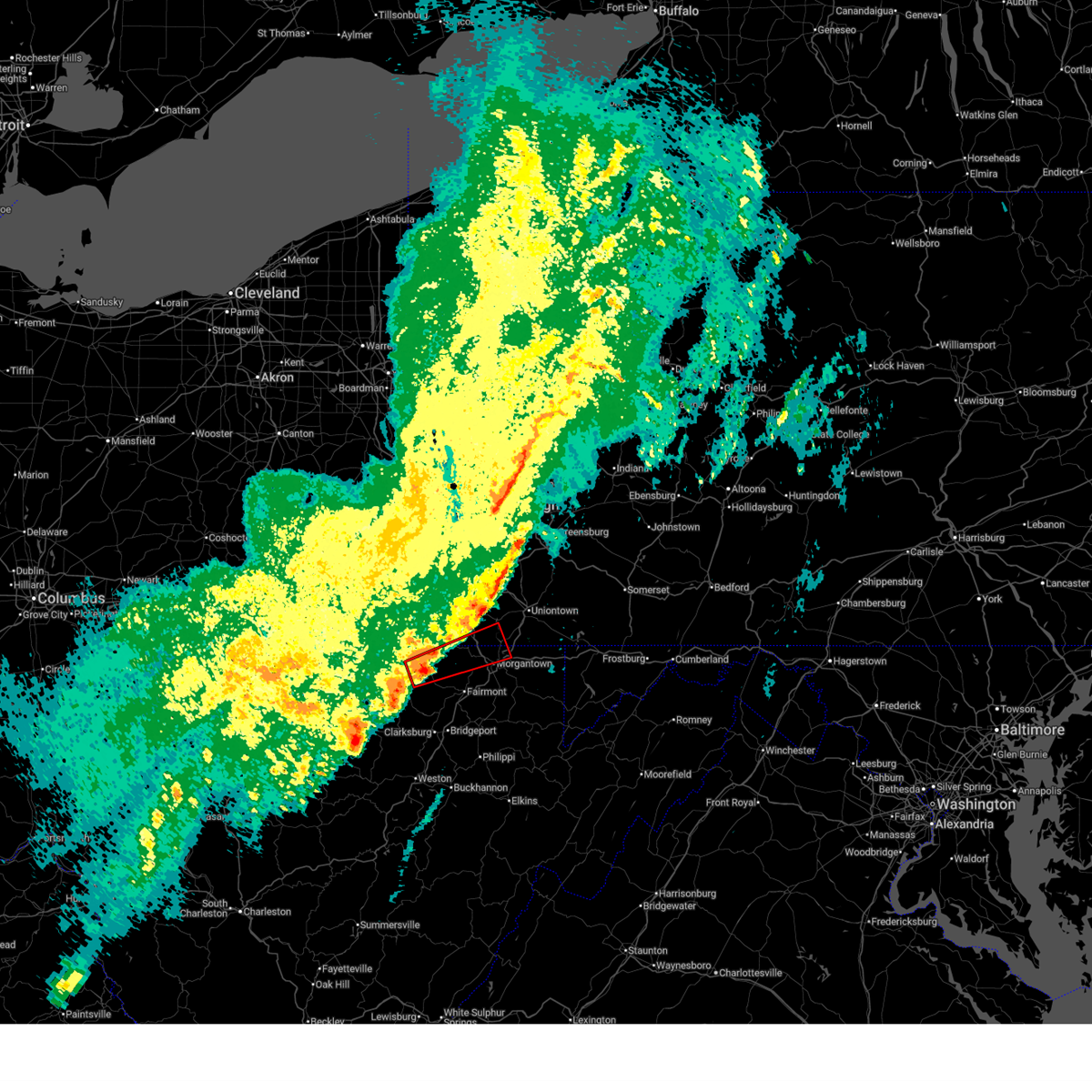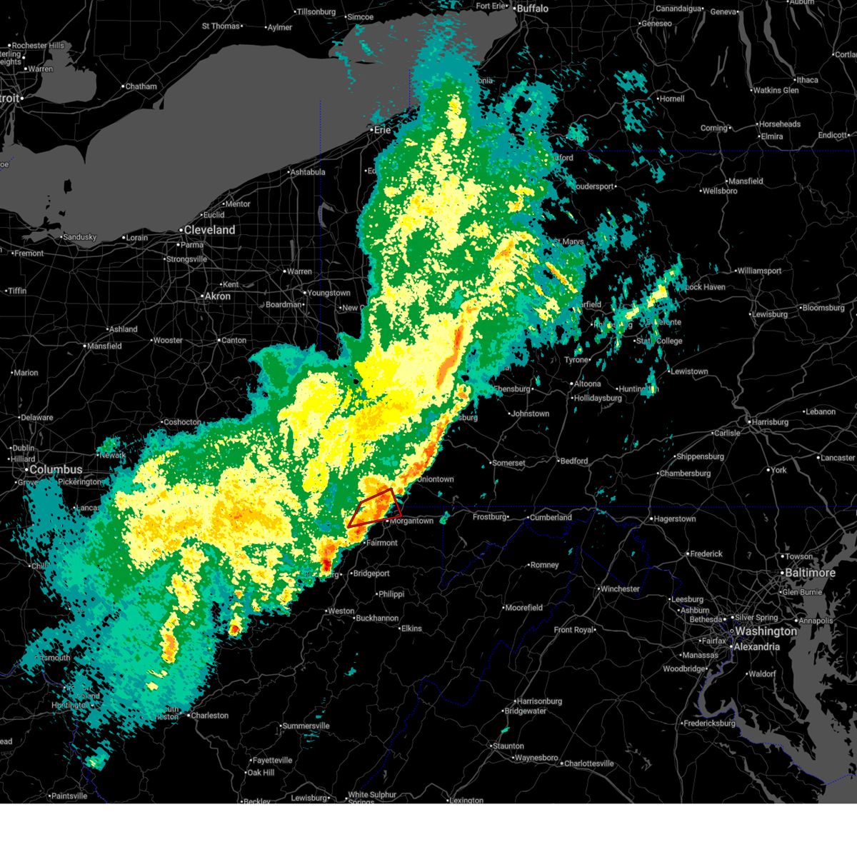 At 630 pm edt, severe thunderstorms were located along a line extending from near uniontown to near grafton, moving east at 60 mph (radar indicated). Hazards include 60 mph wind gusts. Expect damage to trees and power lines, resulting in some power outages. Locations impacted include, morgantown, fairmont, uniontown, westover, kingwood, star city, terra alta, rowlesburg, pleasant valley, winfield, farmington, barrackville, point marion, monongah, granville, newburg, brookhaven, fairchance, rivesville, and smithfield.