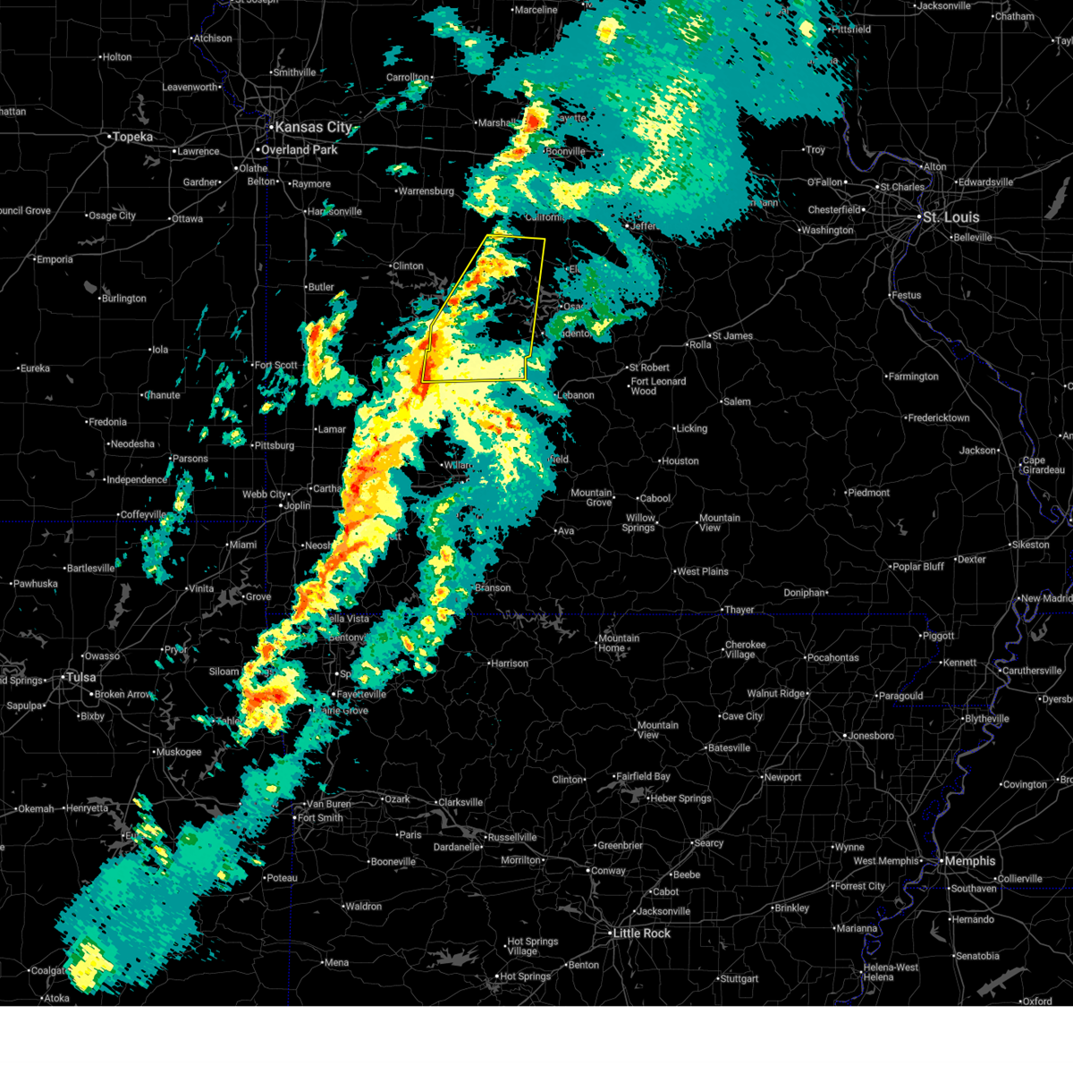 At 1217 am cdt, severe thunderstorms were located along a line extending from humansville to 18 miles southeast of lebanon, and moving south southeast at 25 mph (radar indicated). Hazards include 60 mph wind gusts and nickel size hail. Expect damage to roofs. siding and trees. locations impacted include, bolivar, buffalo, conway, extreme southwestern fort leonard wood, fair play, hermitage, humansville, lebanon, stockton, urbana, weaubleau and wheatland. this warning also includes bennett spring state park, pomme de terre lake, pomme de terre state park, stockton lake and truman lake. interstate 44 between mile markers 109 and 143 will also be impacted by severe thunderstorms. A severe thunderstorm watch remains in effect until 400 am cdt thursday morning for southeast kansas and southwestern missouri.