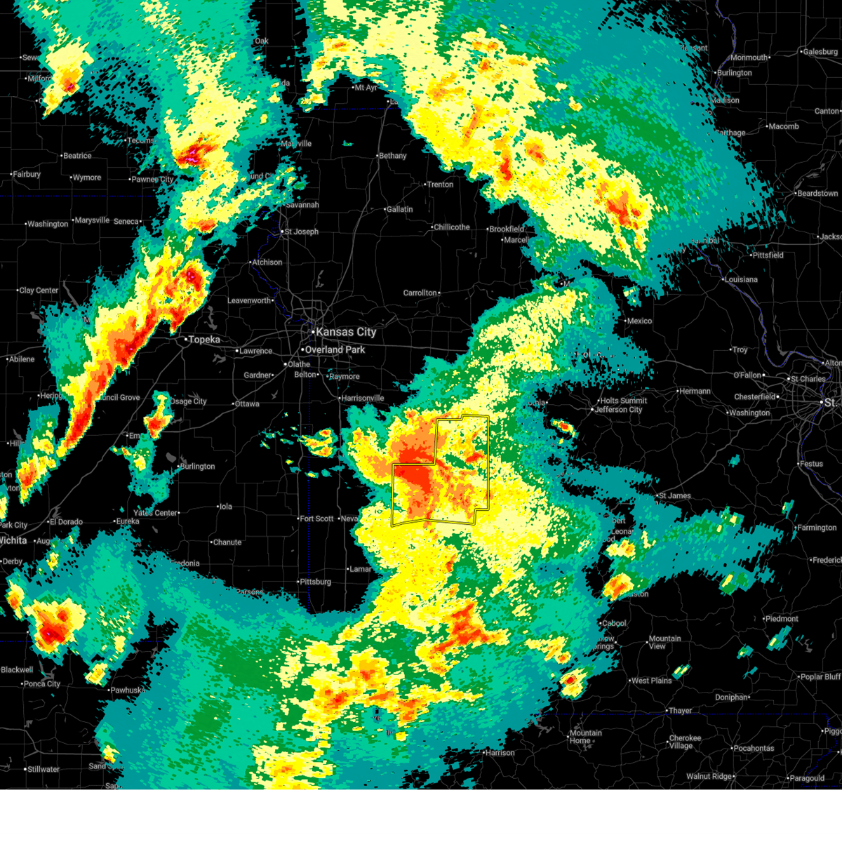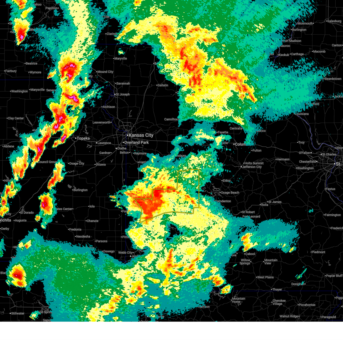 The severe thunderstorm warning for st. clair, northwestern hickory, northern cedar and benton counties will expire at 130 am cdt, , a severe thunderstorm warning remains in effect for the remainder of cedar county until 200 am cdt, the line of storms which prompted the warning has weakened below severe limits, and no longer poses an immediate threat to life or property. however, gusty winds and heavy rain are still possible with these thunderstorms. a tornado watch remains in effect until 500 am cdt sunday morning for southeast kansas and southwestern missouri.