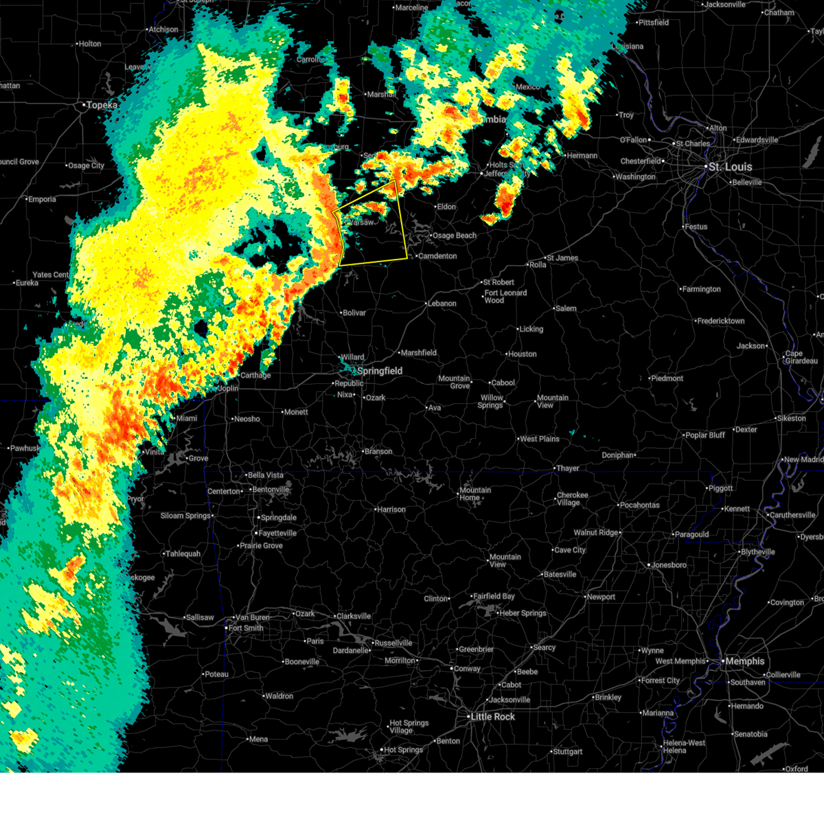 At 1016 pm cdt, severe thunderstorms were located along a line extending from osage beach to 13 miles northwest of macks creek to 9 miles southwest of warsaw, and moving south southeast at 25 mph (radar indicated). Hazards include 60 mph wind gusts and quarter size hail. Hail damage to vehicles is expected. expect wind damage to roofs, siding and trees. locations impacted include, camdenton, hermitage, lake ozark, laurie, macks creek, osage beach, village of four seasons, warsaw and wheatland. this warning also includes ha ha tonka state park, lake of the ozarks state park, lake of the ozarks, truman lake and truman state park. a tornado warning also remains in effect for southwestern benton and northern hickory counties. A tornado watch remains in effect until midnight cdt thursday morning for southeast kansas and southern missouri.