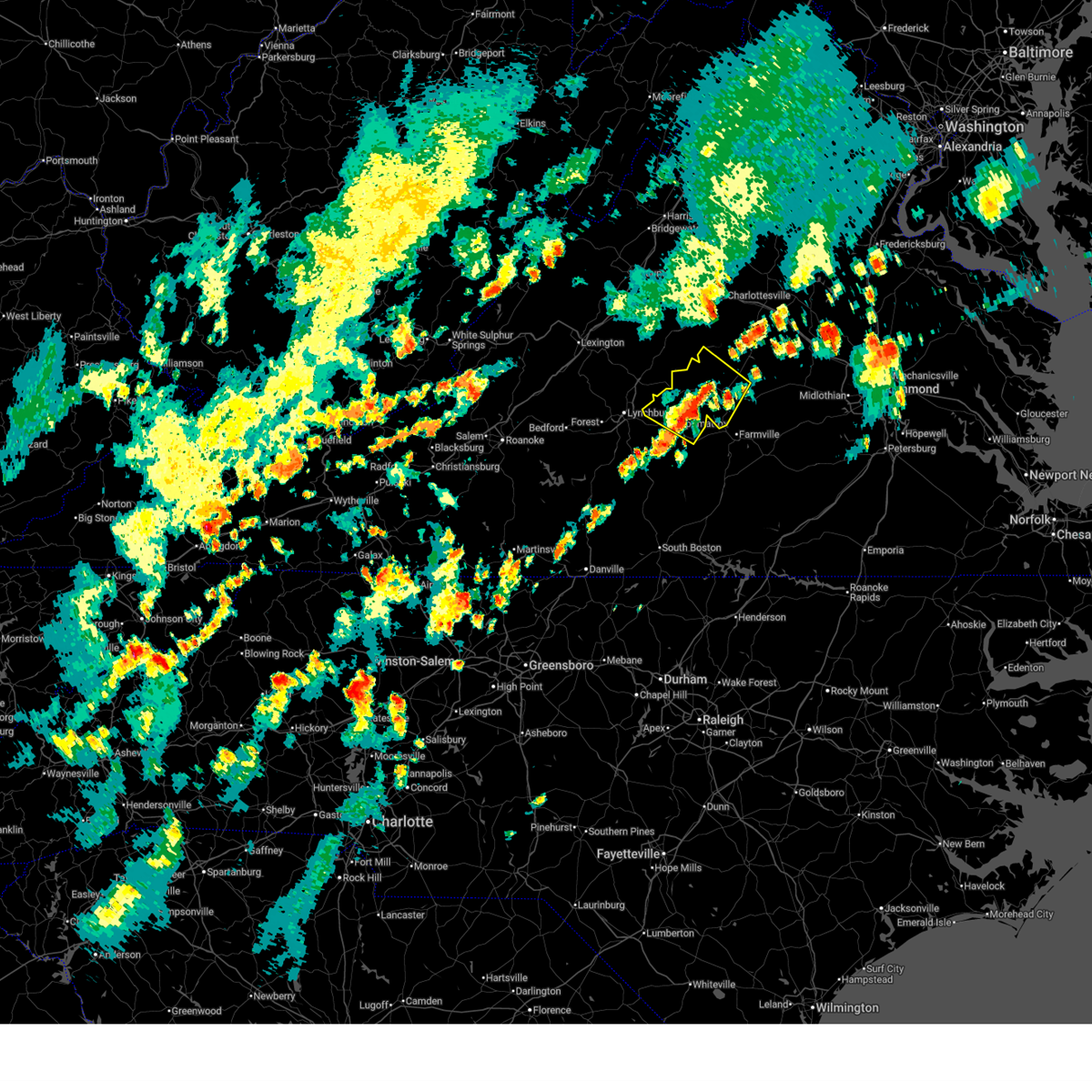 At 507 pm edt, severe thunderstorms were located along a line extending from near wingina to 6 miles north of hixburg to near evergreen to near hat creek, moving east at 50 mph (radar indicated). Hazards include 60 mph wind gusts. Expect damage to roofs, siding, and trees. Locations impacted include, lynchburg, buckingham, altavista, appomattox, hurt, gretna, and brookneal.