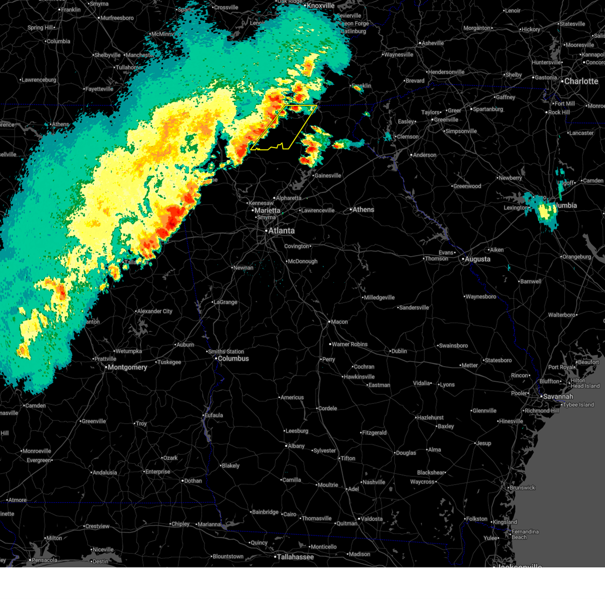 At 332 pm edt, severe thunderstorms were located along a line extending from near hiawassee to owltown to near dial, moving east at 50 mph (radar indicated). Hazards include 70 mph wind gusts. Expect considerable tree damage. Damage is likely to mobile homes, roofs, and outbuildings.