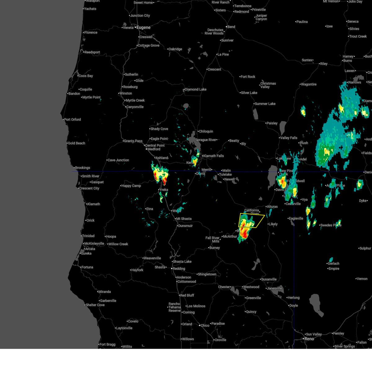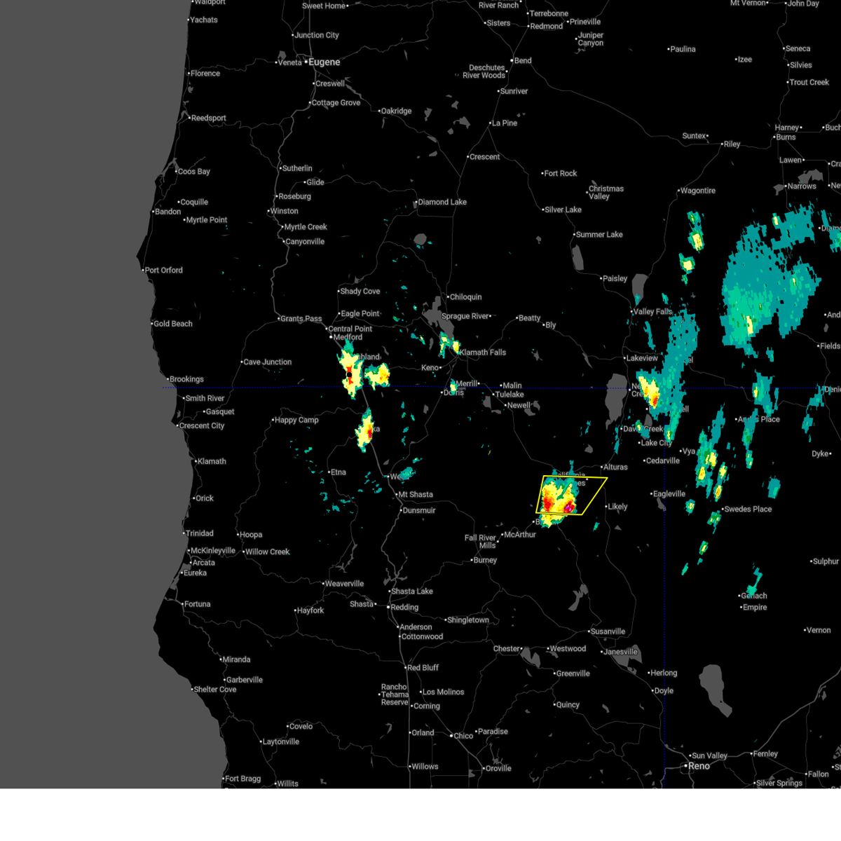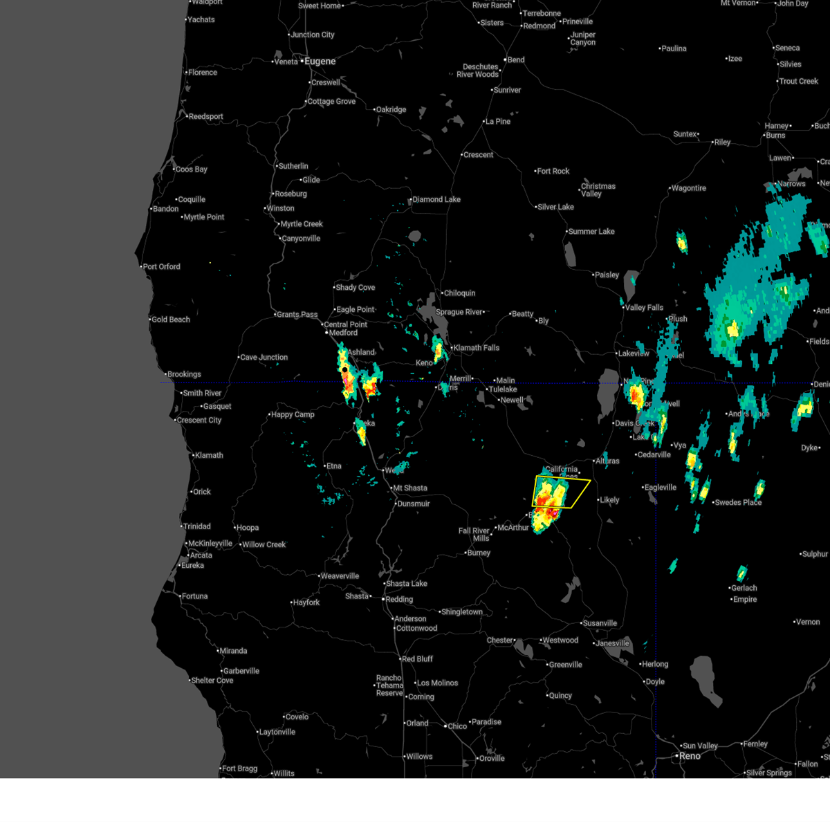 At 433 pm pdt, a severe thunderstorm was located near adin, or 14 miles northeast of bieber, moving north at 25 mph (radar indicated). Hazards include 60 mph wind gusts and quarter size hail. Hail damage to vehicles is expected. expect wind damage to roofs, siding, and trees. Locations impacted include, lower rush creek campground and adin.