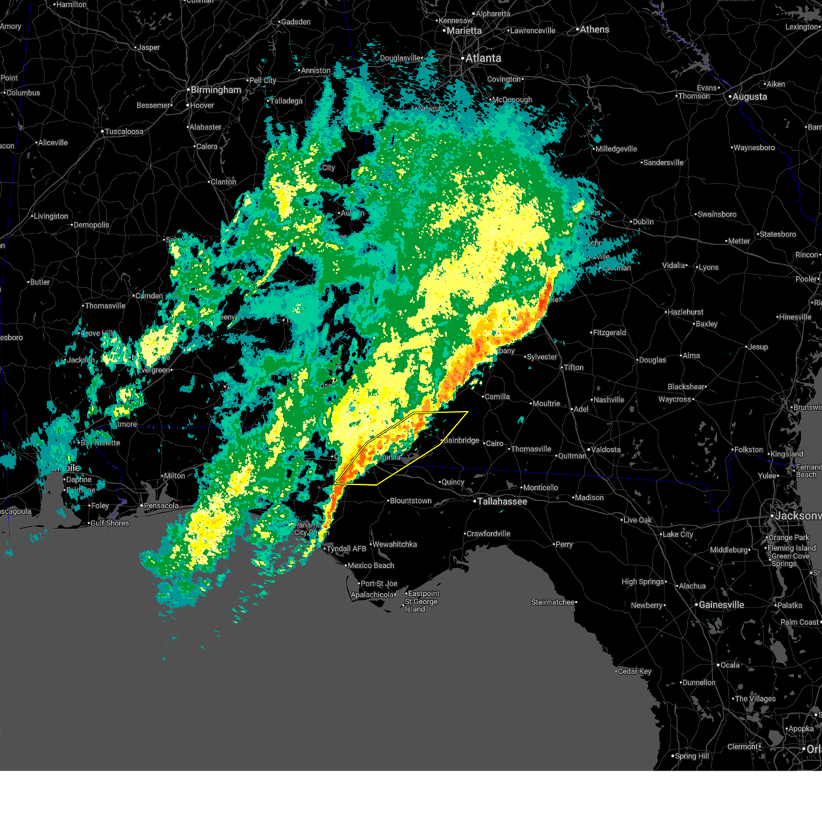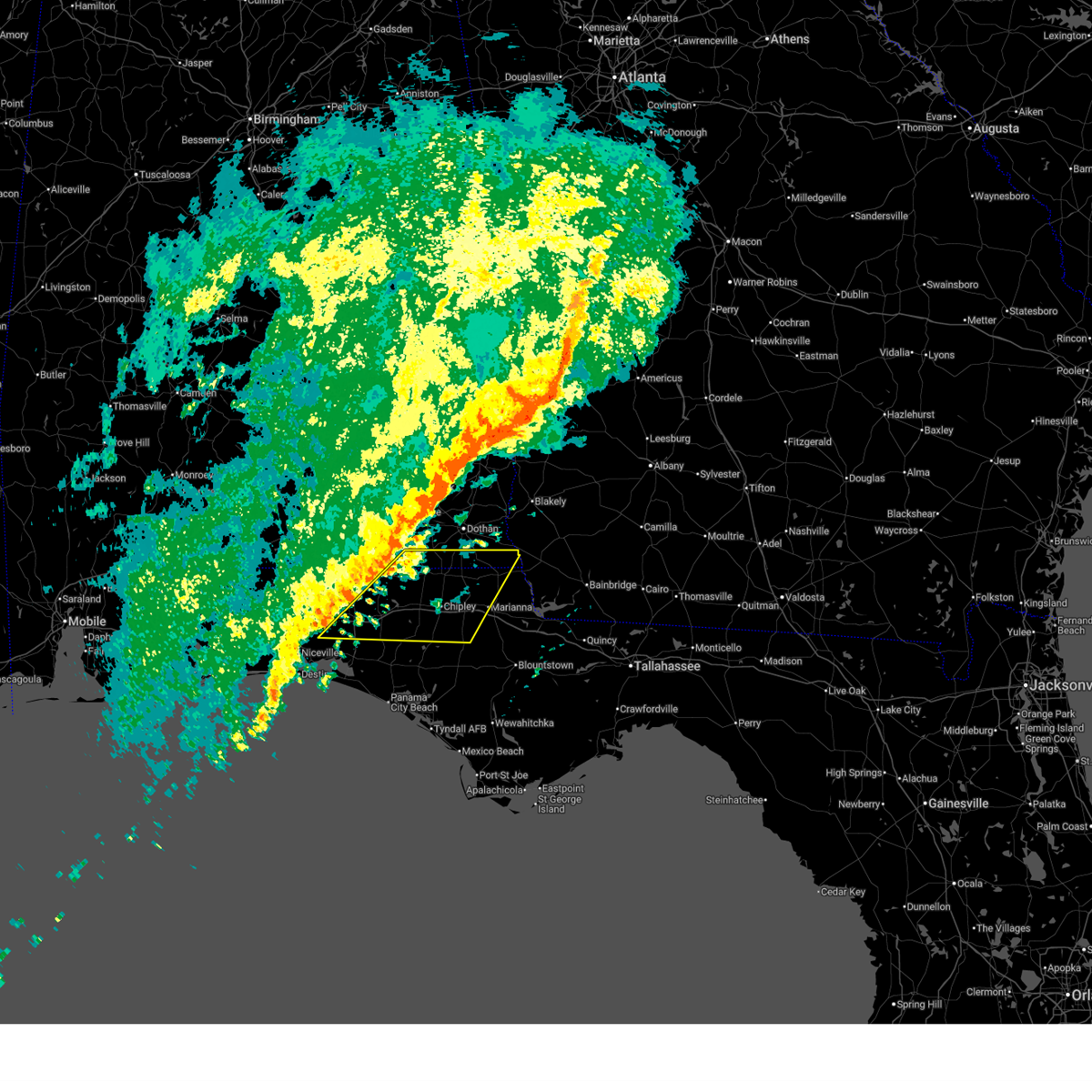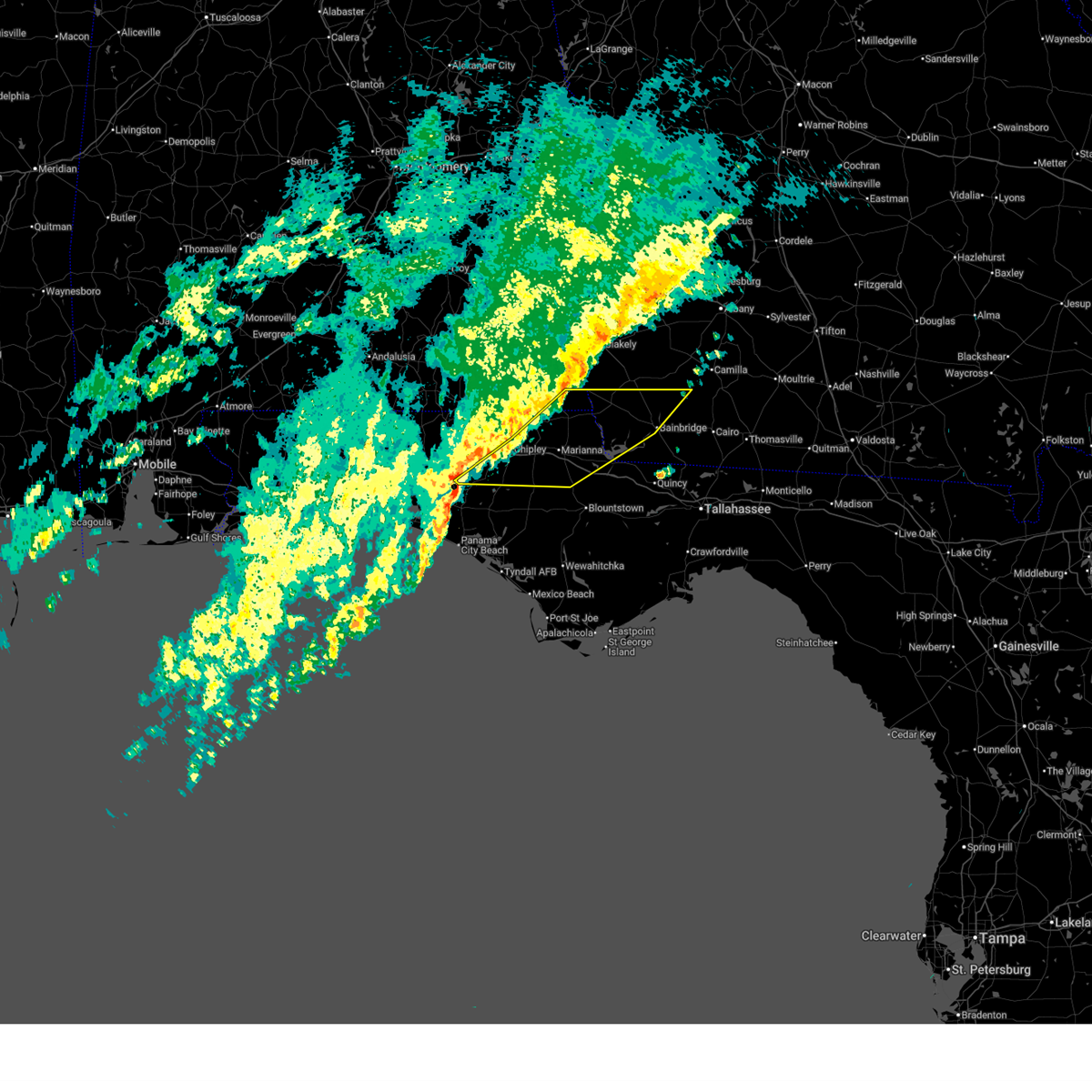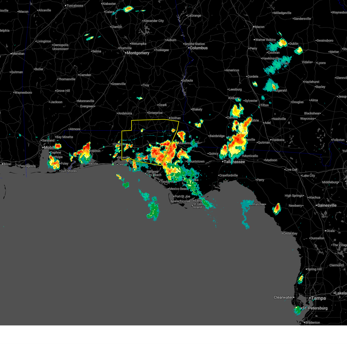 At 726 pm cst, severe thunderstorms were located along a line extending from near daleville to near bonifay to vernon to 16 miles northwest of panama city beach, moving east at 60 mph. these are very dangerous storms (radar indicated). Hazards include 80 mph wind gusts. Flying debris will be dangerous to those caught without shelter. mobile homes will be heavily damaged. expect considerable damage to roofs, windows, and vehicles. extensive tree damage and power outages are likely. locations impacted include, panama city, lynn haven, panama city beach, daleville, cottonwood, vernon, ozark, bonifay, fort rucker, headland, marianna, enterprise, chipley, graceville, dothan, springfield, hartford, taylor, midland city and kinsey. A tornado watch remains in effect until 1000 pm cst for southeastern alabama, and the panhandle of florida.