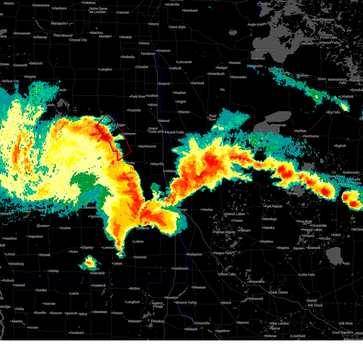 Svrfgf the national weather service in grand forks has issued a * severe thunderstorm warning for, southwestern grand forks county in northeastern north dakota, southeastern nelson county in northeastern north dakota, northern cass county in southeastern north dakota, traill county in southeastern north dakota, northeastern barnes county in southeastern north dakota, steele county in southeastern north dakota, * until midnight cdt. * at 1116 pm cdt, severe thunderstorms were located along a line extending from near red willow lake to luverne to 6 miles northeast of valley city, moving east at 70 mph. these are destructive storms for grand forks, nelson, cass, traill, barnes, steele (public). Hazards include 90 mph wind gusts and ping pong ball size hail. You are in a life-threatening situation. flying debris may be deadly to those caught without shelter. mobile homes will be heavily damaged or destroyed. homes and businesses will have substantial roof and window damage. expect extensive tree damage and power outages. severe thunderstorms will be near, hope and kloten around 1120 pm cdt. finley, aneta, and sharon around 1125 pm cdt. page and ayr around 1130 pm cdt. golden lake, galesburg, and erie around 1135 pm cdt. mayville, northwood, and hatton around 1140 pm cdt. other locations impacted by these severe thunderstorms include american crystal sugar. This includes interstate 29 between mile markers 82 and 119.