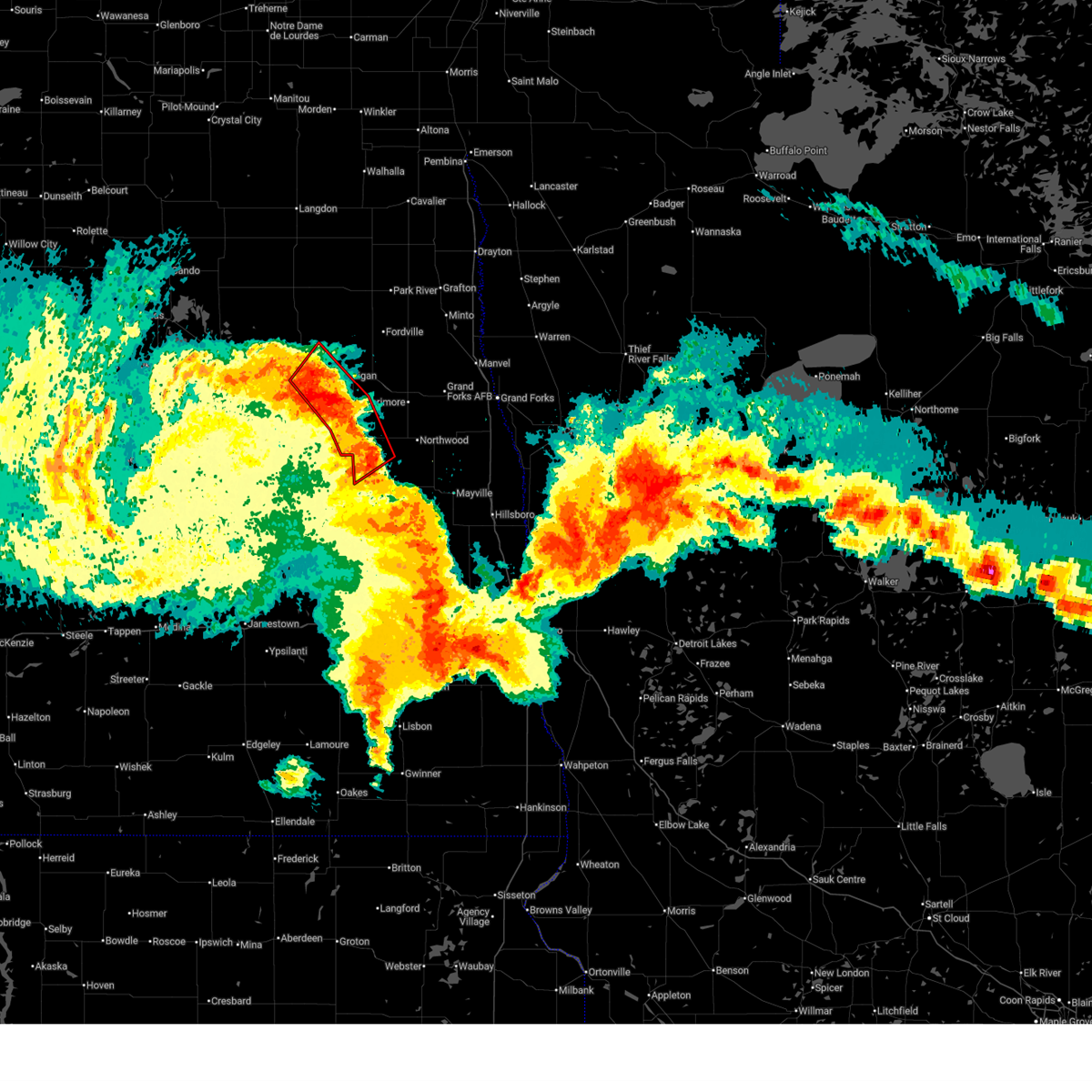 At 340 am cdt, a severe thunderstorm capable of producing a tornado was located near sharon, or 41 miles southwest of grand forks, moving northeast at 50 mph (radar indicated rotation). Hazards include tornado. Expect damage to mobile homes, roofs, and vehicles. this dangerous storm will be near, northwood around 355 am cdt. kempton around 400 am cdt. larimore around 405 am cdt. Arvilla and turtle river state park around 410 am cdt.