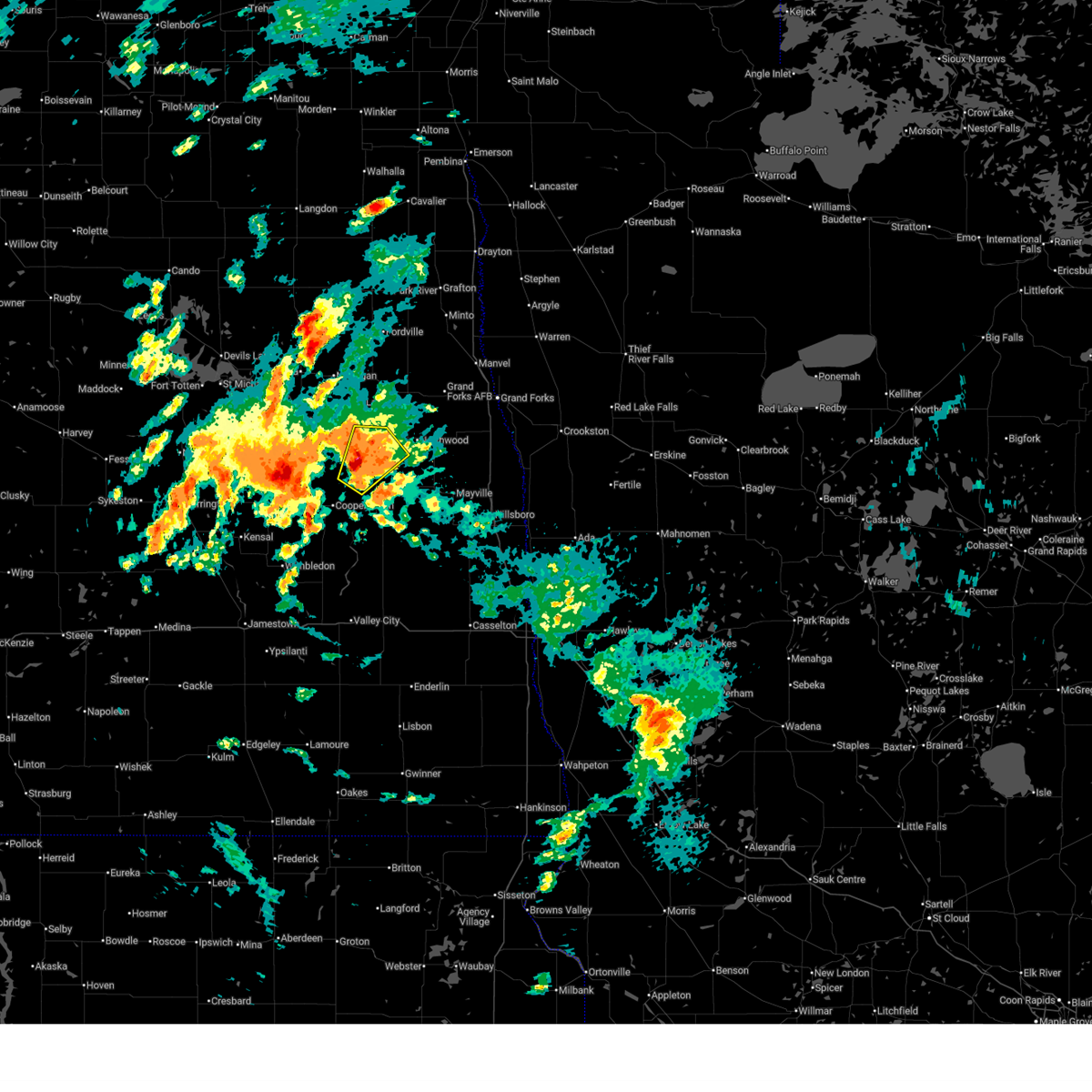 At 324 am cdt, severe thunderstorms were located along a line extending from near voss to near emerado to near hope, moving east at 45 mph (radar indicated). Hazards include 60 mph wind gusts. Expect damage to roofs. siding. and trees. these severe storms will be near, forest river, emerado and grand forks afb around 325 am cdt. minto and ardoch around 330 am cdt. grand forks, warsaw and merrifield around 335 am cdt. poland around 340 am cdt. east grand forks, oslo and alvarado around 345 am cdt. Also includes interstate 29 between mile markers 102 and 168.