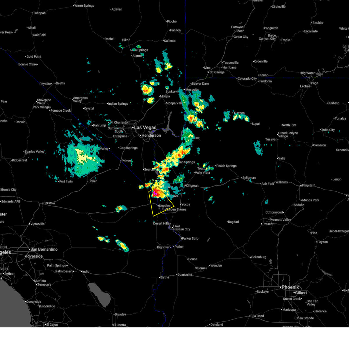 At 141 am pdt/141 am mst/, doppler radar indicated a severe thunderstorm capable of producing quarter size hail and damaging winds in excess of 60 mph. this storm was located near golden valley, moving east at 25 mph. strong thunderstorm winds continue to impact the surrounding areas, especially near bullhead city and laughlin. locations impacted include, bullhead city, kingman, laughlin, katherine landing, yucca, topock, needles, oatman, chloride, cottonwood cove campground, hualapai mountain park, new kingman-butler, and highway 95 and i-40.