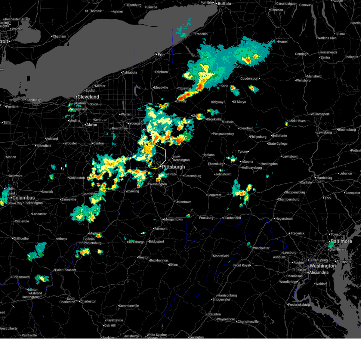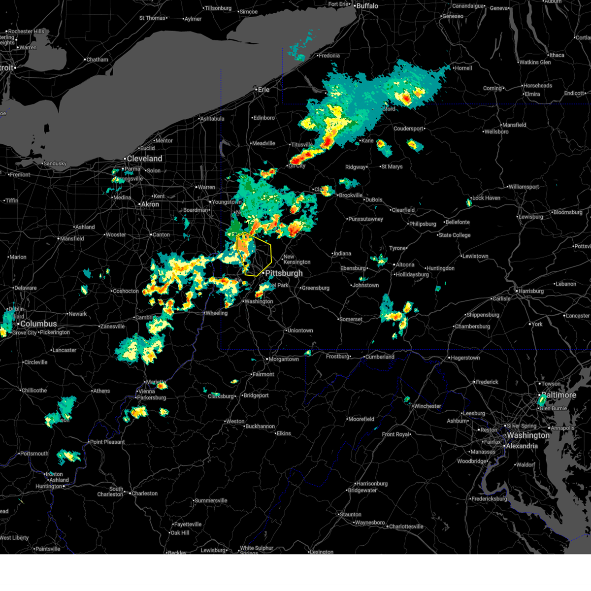 At 327 pm edt, a severe thunderstorm was located over rochester, or over beaver falls, moving east at 40 mph (radar indicated). Hazards include 60 mph wind gusts. Expect damage to trees and power lines. resulting in some power outages. locations impacted include, cranberry, franklin park, aliquippa, beaver falls, monaca, economy, ambridge, new brighton, beaver, baden, zelienople, rochester, ohioville, harmony township, seven fields, industry, evans city, patterson township, conway and big beaver. this includes the following highways, pennsylvania turnpike between mile markers 12 and 31. interstate 79 in pennsylvania between mile markers 70 and 86. interstate 279 in pennsylvania near mile marker 13. interstate 376 in pennsylvania between mile markers 31 and 40. Please report severe weather by calling 4 1 2, 2 6 2, 1 9 8 8, posting to the nws pittsburgh facebook page, or using twitter @nwspittsburgh.