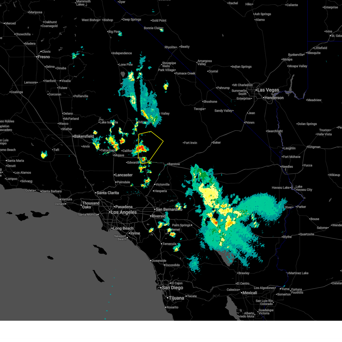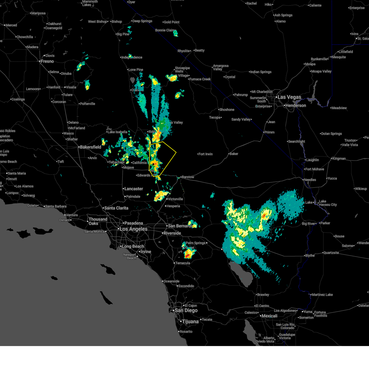 Svrvef the national weather service in las vegas has issued a * severe thunderstorm warning for, west central san bernardino county in southern california, * until 545 pm pdt. * at 501 pm pdt, a severe thunderstorm was located 13 miles southeast of randsburg, or 30 miles south of ridgecrest, moving northeast at 25 mph (radar indicated). Hazards include 60 mph wind gusts and quarter size hail. Hail damage to vehicles is expected. Expect wind damage to roofs and trees.