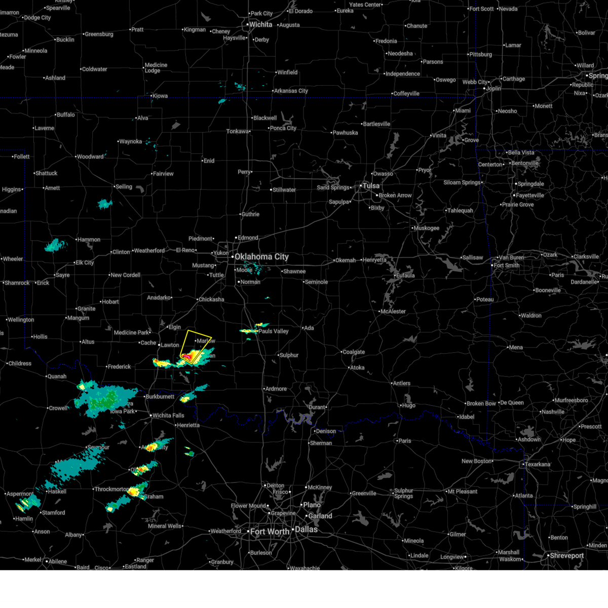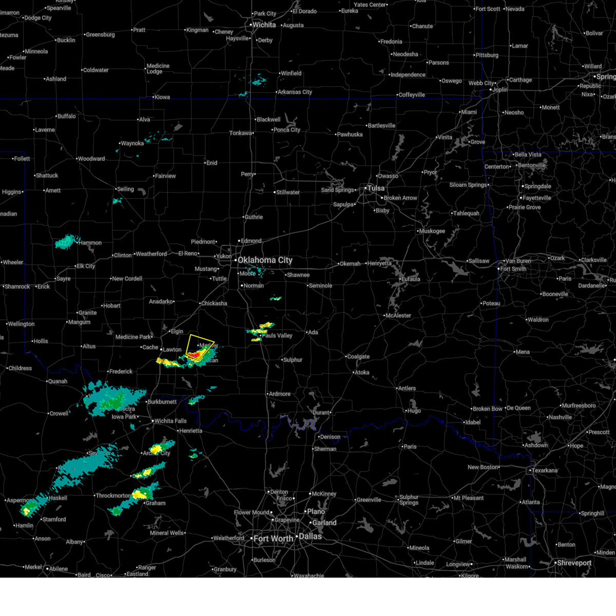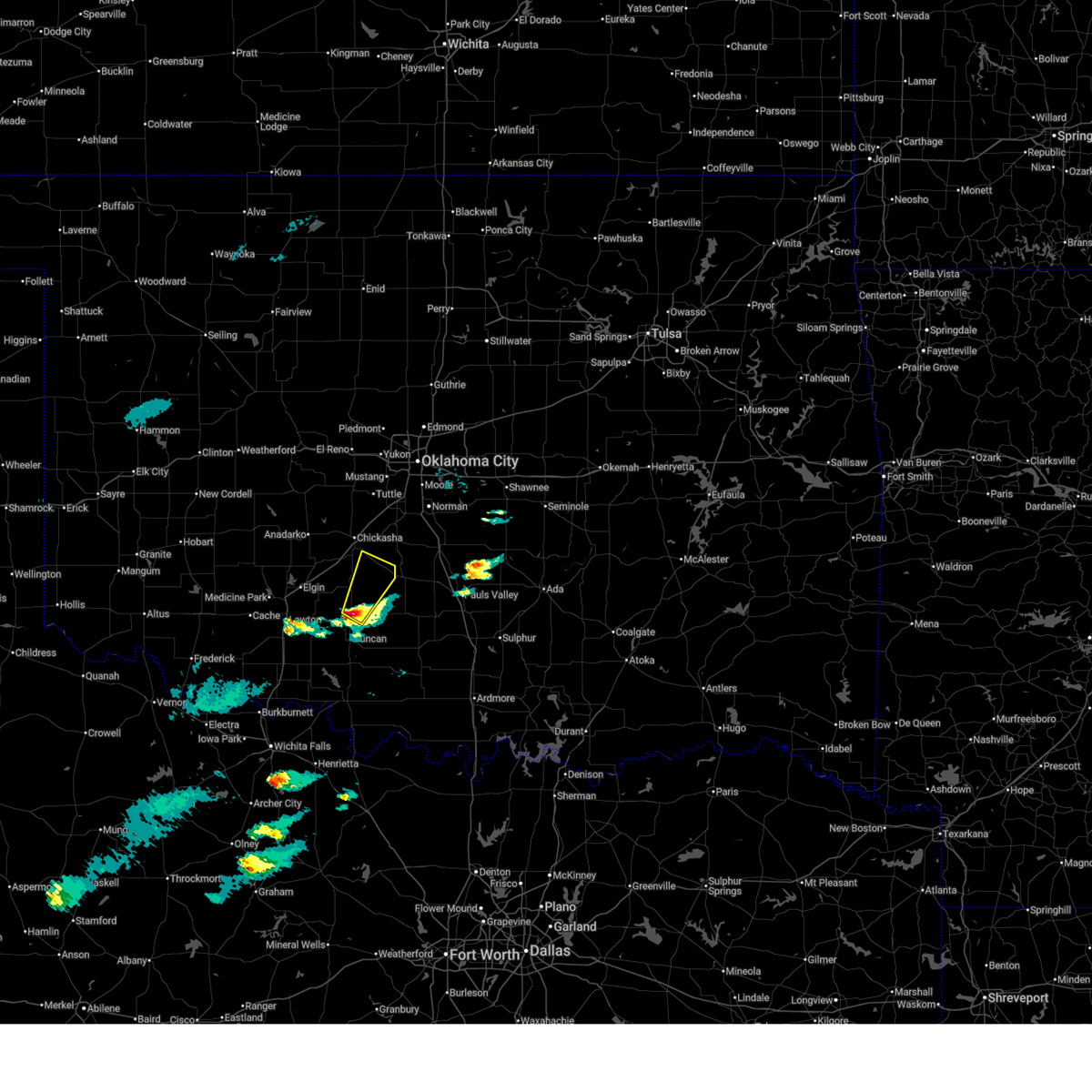 At 720 am cdt, severe thunderstorms were located along a line extending from 5 miles west of rush springs to 9 miles west of marlow to 7 miles northeast of geronimo, moving southeast at 45 mph (radar indicated). Hazards include golf ball size hail. People and animals outdoors will be injured. expect damage to roofs, siding, windows and vehicles. locations impacted include, lawton, duncan, marlow, elgin, comanche, rush springs, bray, fletcher, cyril, sterling, velma, foster, loco, eastern fort sill, central high, empire city, pernell, cox city, hulen and acme. 1. 75in.