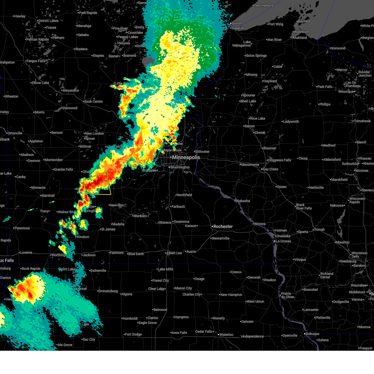 At 1049 pm cdt, severe thunderstorms were located along a line extending from near hector to franklin to near morgan, moving east at 55 mph. these are very dangerous storms (radar indicated). Hazards include 80 mph wind gusts. redwood falls airport gusted to 78 mph at 1045 pm. Flying debris will be dangerous to those caught without shelter. mobile homes will be heavily damaged. expect considerable damage to roofs, windows, and vehicles. extensive tree damage and power outages are likely. severe thunderstorms will be near, fairfax and buffalo lake around 1100 pm cdt. stewart around 1105 pm cdt. gibbon around 1110 pm cdt. winthrop, brownton and lafayette around 1115 pm cdt. new ulm around 1120 pm cdt. glencoe and gaylord around 1125 pm cdt. Other locations impacted by these severe thunderstorms include klossner, sumter, essig, biscay, st george, fernando, new ulm airport, new auburn, lake marion regional park and evan.
