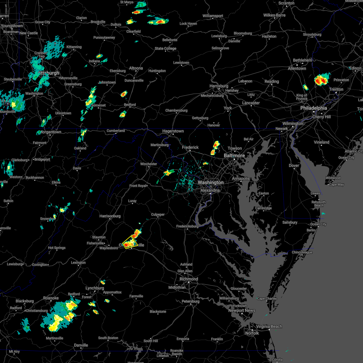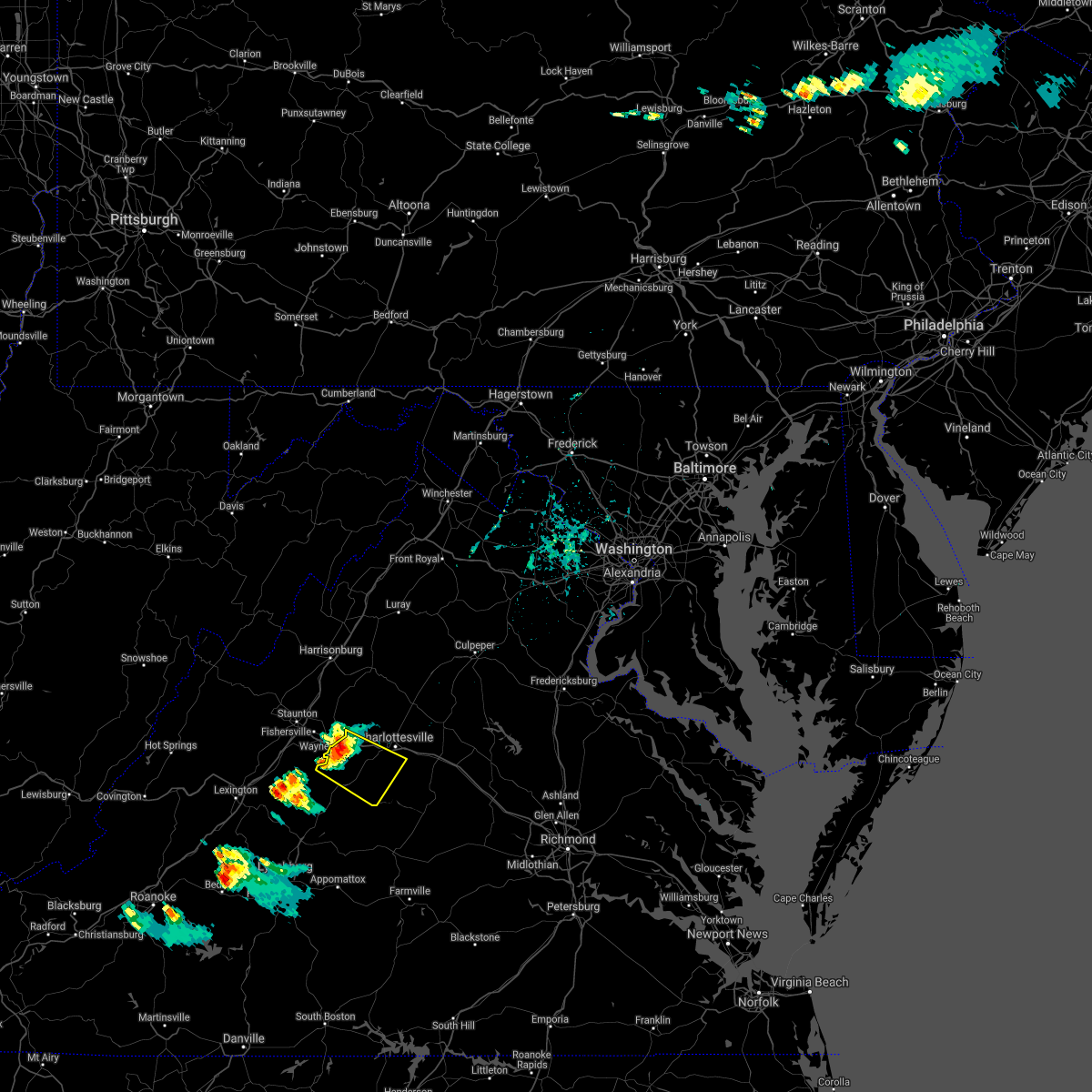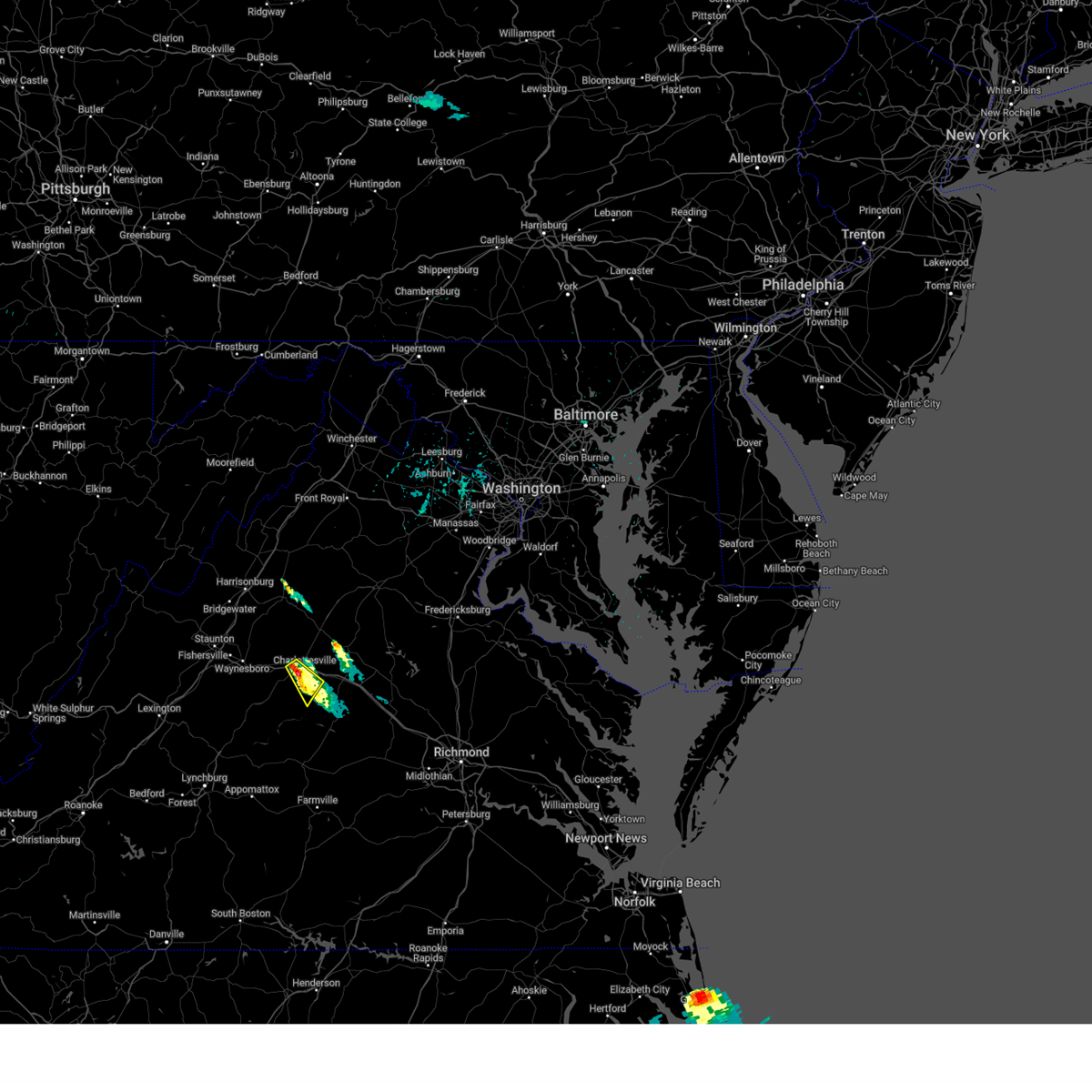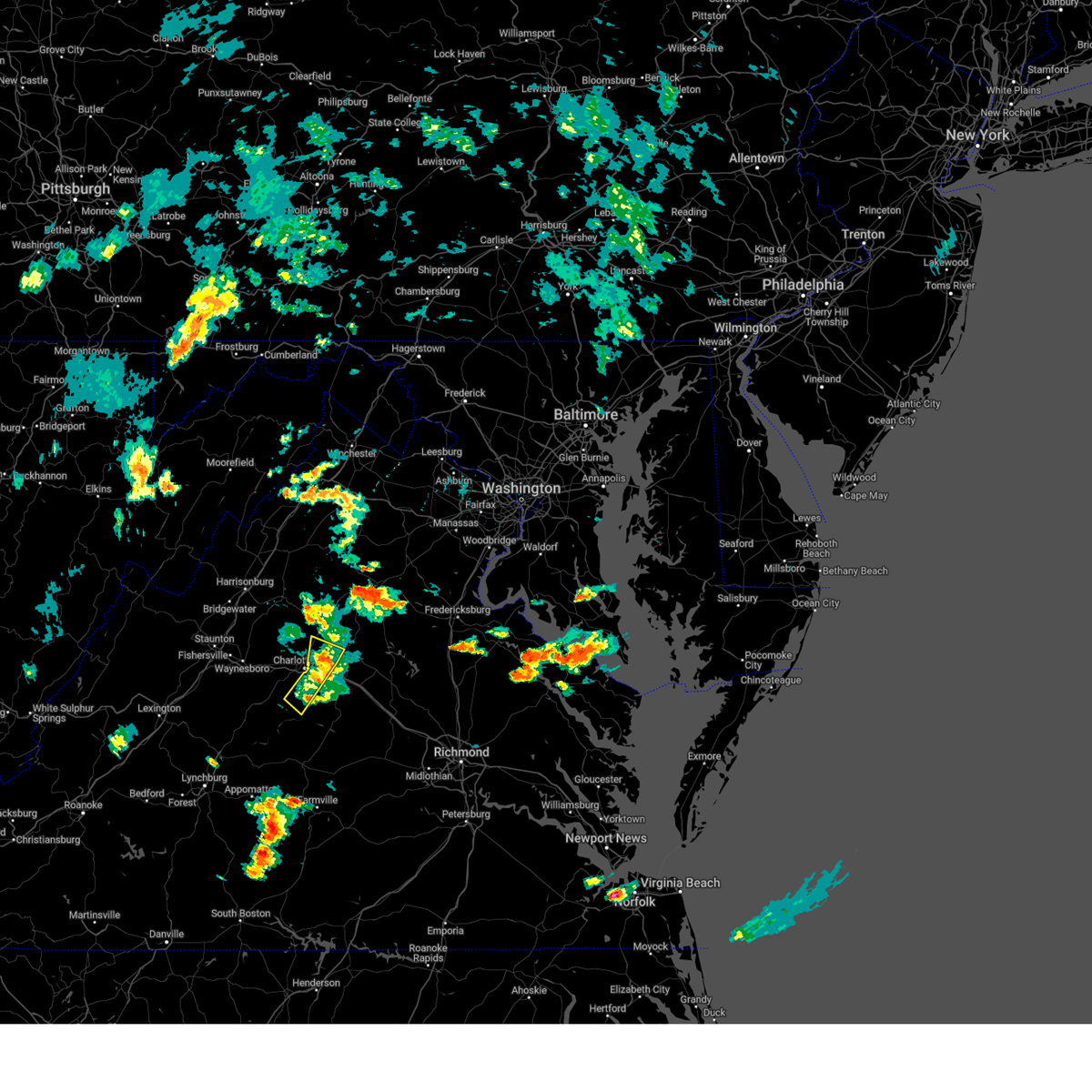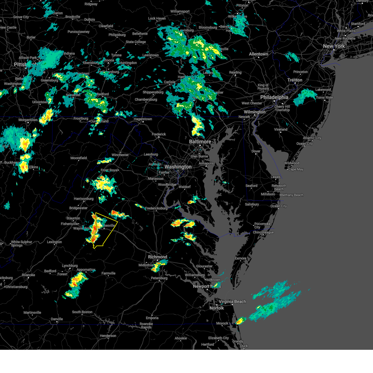Svrlwx the national weather service in sterling virginia has issued a * severe thunderstorm warning for, madison county in northwestern virginia, the city of charlottesville in central virginia, southwestern orange county in central virginia, southeastern rockingham county in western virginia, central albemarle county in central virginia, southern rappahannock county in northwestern virginia, greene county in central virginia, southwestern culpeper county in northern virginia, * until 915 pm edt. * at 809 pm edt, a severe thunderstorm was located near crozet, or 10 miles southeast of waynesboro, moving northeast at 55 mph (radar indicated). Hazards include 60 mph wind gusts and quarter size hail. Damaging winds will cause some trees and large branches to fall. this could injure those outdoors, as well as damage homes and vehicles. roadways may become blocked by downed trees. localized power outages are possible. Unsecured light objects may become projectiles.