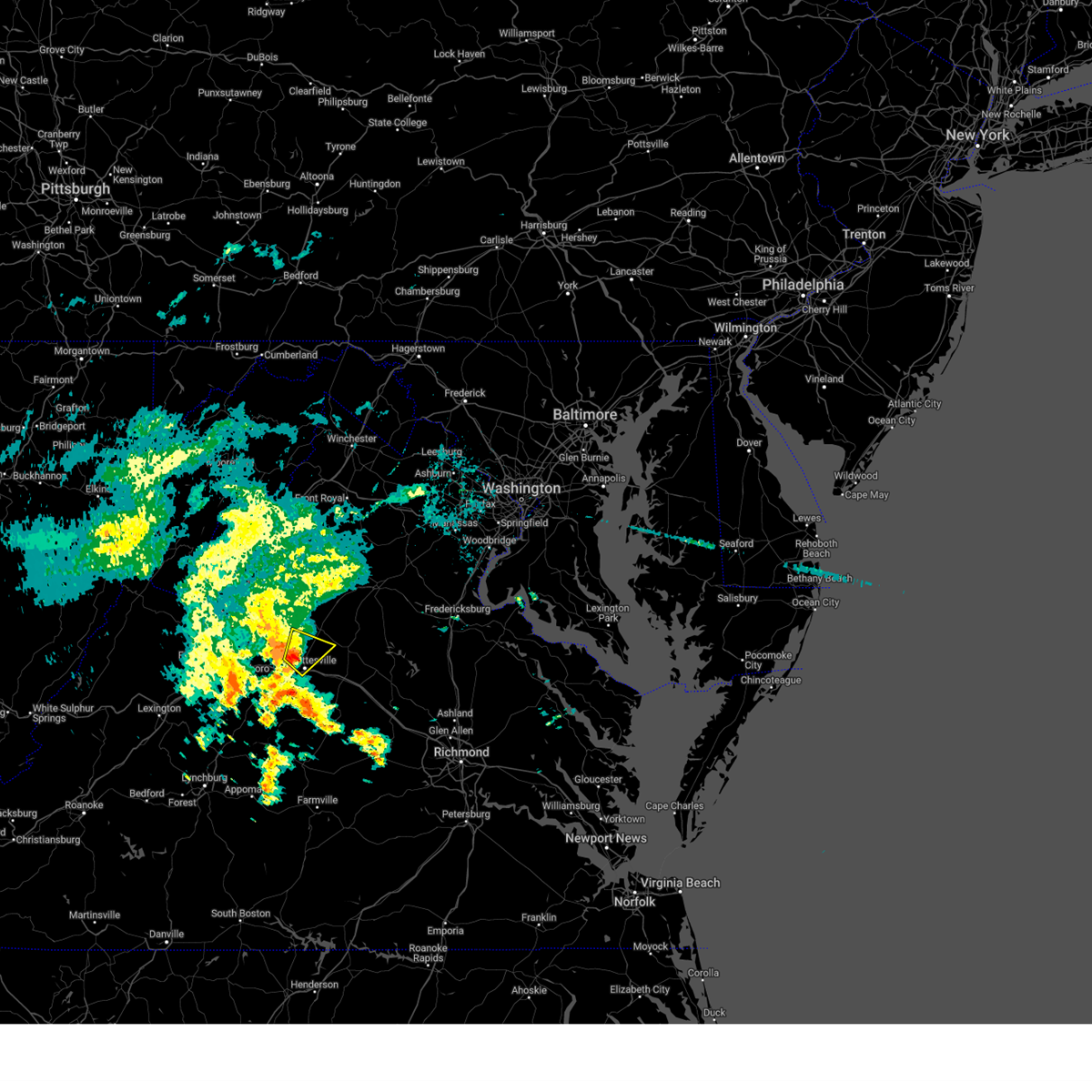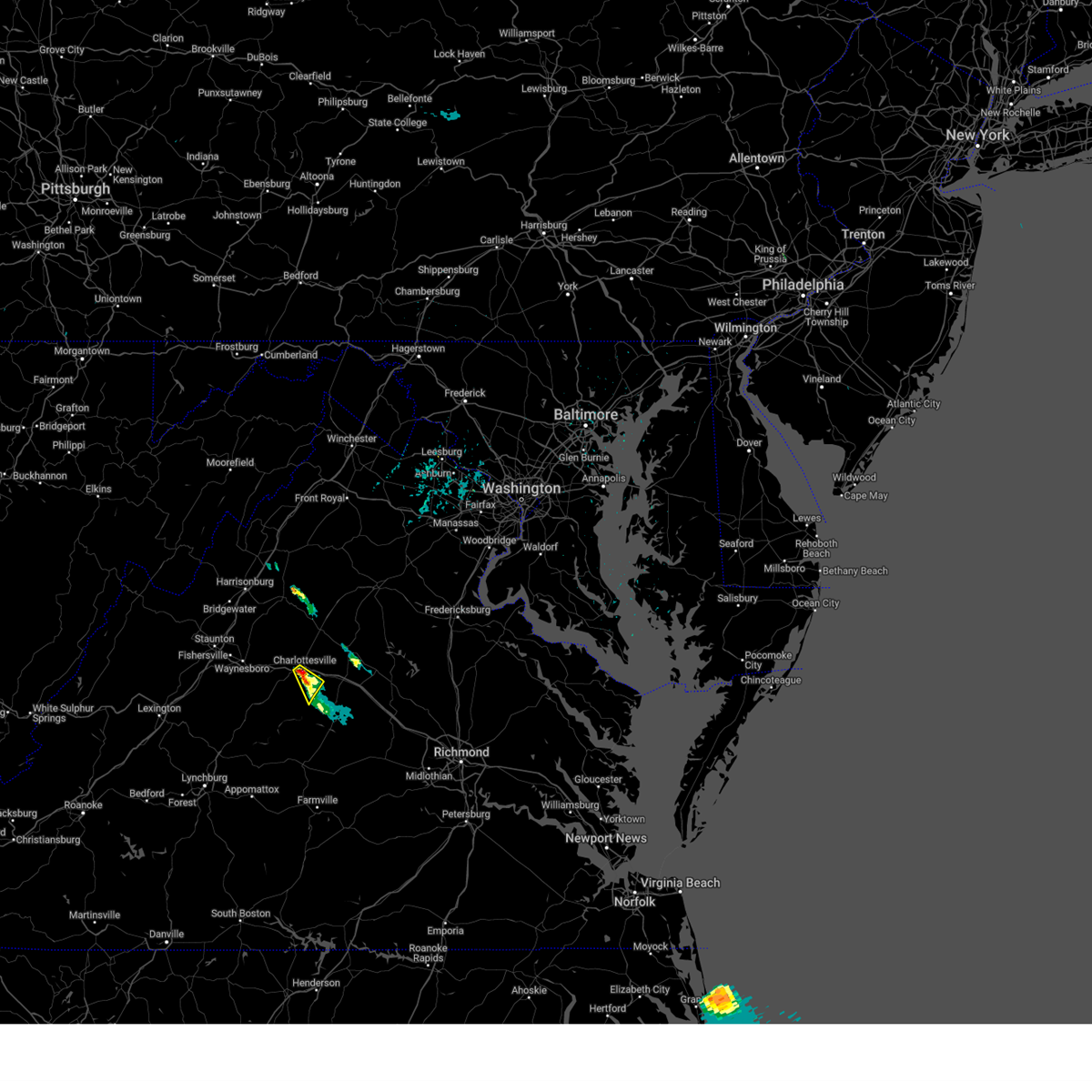 Svrlwx the national weather service in sterling virginia has issued a * severe thunderstorm warning for, the city of charlottesville in central virginia, southwestern orange county in central virginia, east central albemarle county in central virginia, * until 430 pm edt. * at 401 pm edt, a severe thunderstorm was located over charlottesville, moving northeast at 45 mph (radar indicated). Hazards include 60 mph wind gusts and quarter size hail. Damaging winds will cause some trees and large branches to fall. this could injure those outdoors, as well as damage homes and vehicles. roadways may become blocked by downed trees. localized power outages are possible. Unsecured light objects may become projectiles.