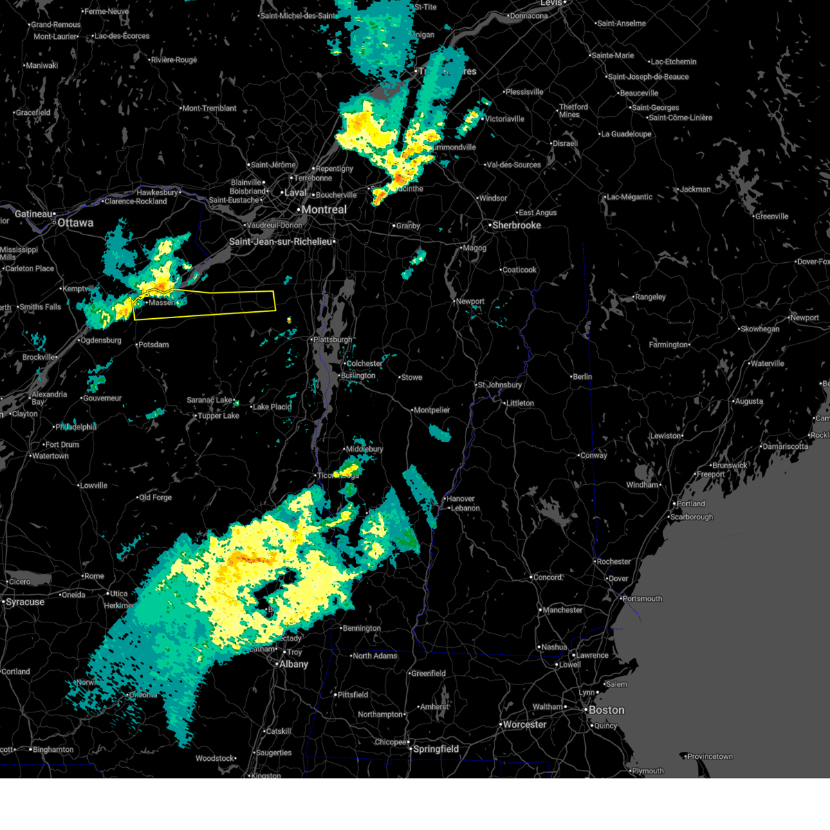 Svrbtv the national weather service in burlington has issued a * severe thunderstorm warning for, northwestern clinton county in northern new york, northern franklin county in northern new york, northeastern st. lawrence county in northern new york, * until 915 pm edt. * at 834 pm edt, a severe thunderstorm was located over massena village, moving east at 65 mph (radar indicated). Hazards include 60 mph wind gusts. expect damage to trees and powerlines