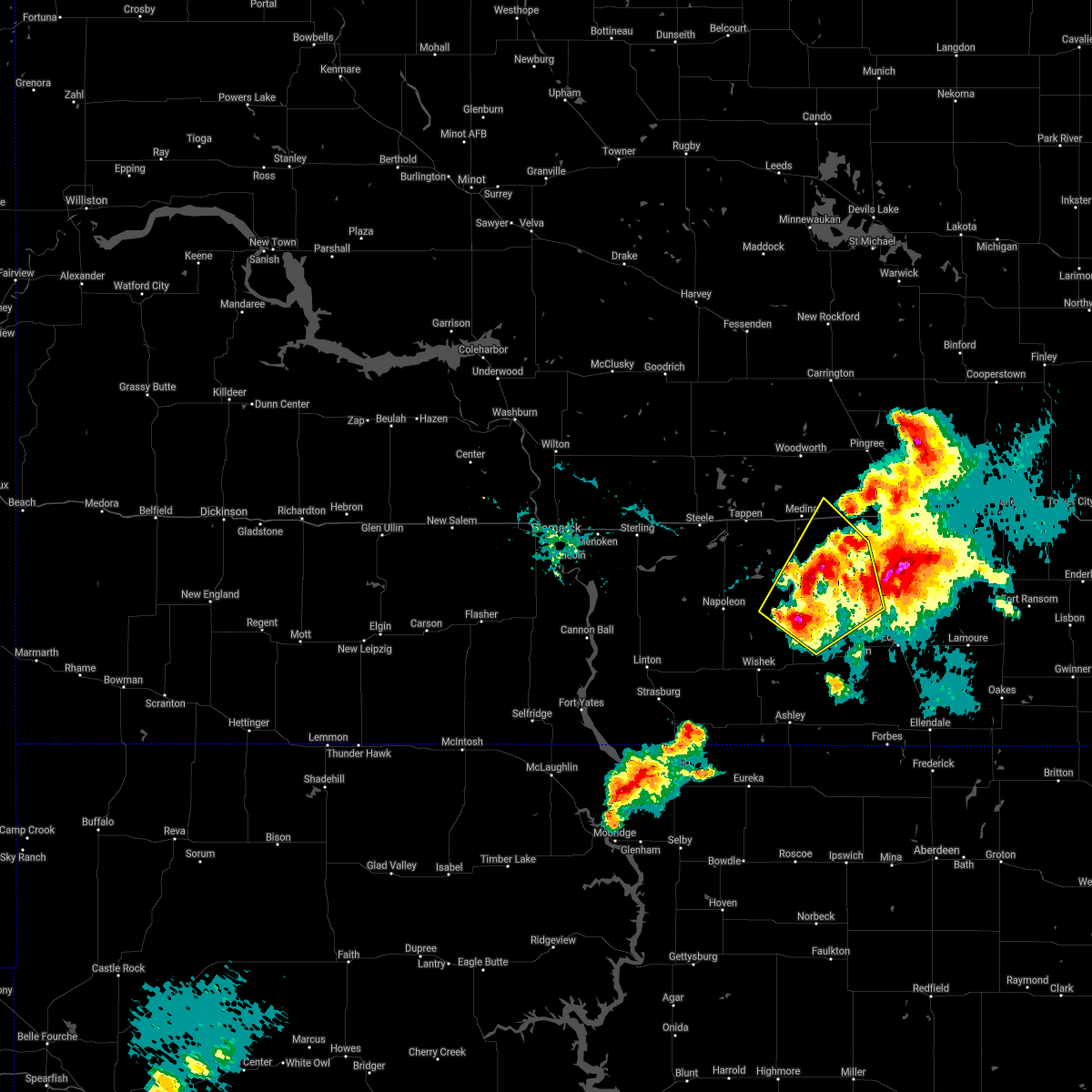 At 1013 pm cdt, severe thunderstorms were located along a line extending from 7 miles west of medina to 12 miles northeast of hague, moving east at 55 mph (radar indicated). Hazards include 70 mph wind gusts and nickel size hail. Expect considerable tree damage. damage is likely to mobile homes, roofs and outbuildings. Locations impacted include, napoleon, ashley, steele, medina, wishek, gackle, tappen, streeter, cleveland, lehr, dawson, lake isabel, eldridge, windsor, fredonia, crystal springs, burnstad, kintyre, green lake and danzig.