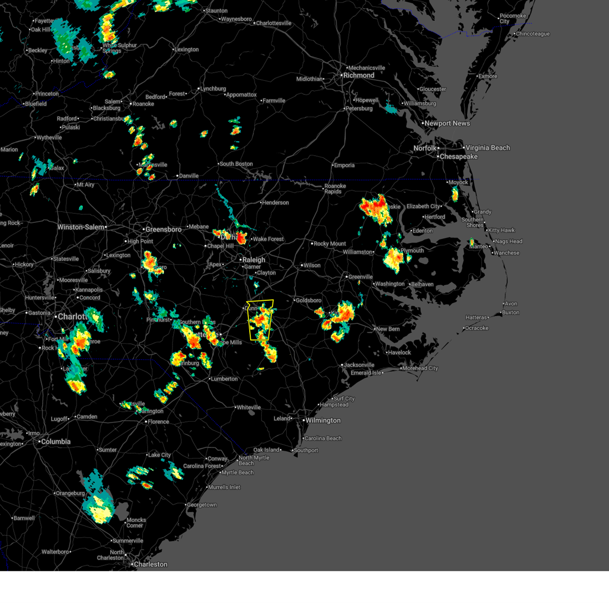 At 242 pm edt, severe thunderstorms were located along a line extending from near angier to near dunn to near godwin to 7 miles north of jerome to near st. pauls, moving east at 60 mph (radar indicated). Hazards include 70 mph wind gusts. Expect considerable tree damage. damage is likely to mobile homes, roofs, and outbuildings. Locations impacted include, mar-mac, salemburg, harrells, seven springs, falcon, selma, smithfield, dunn, kenly, and buckhorn reservoir.