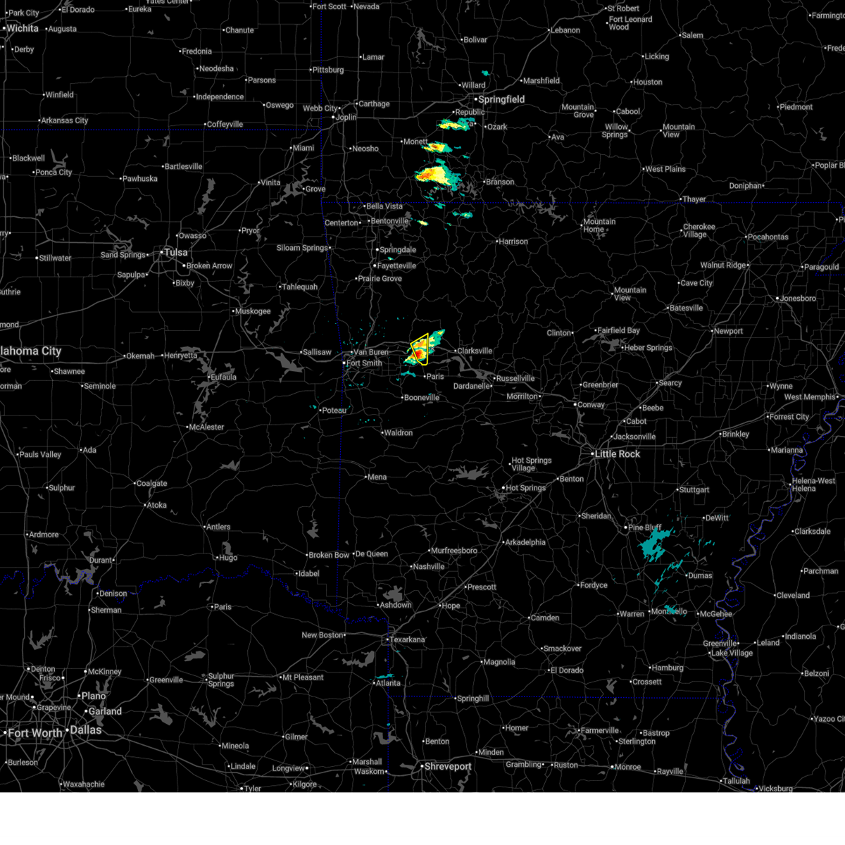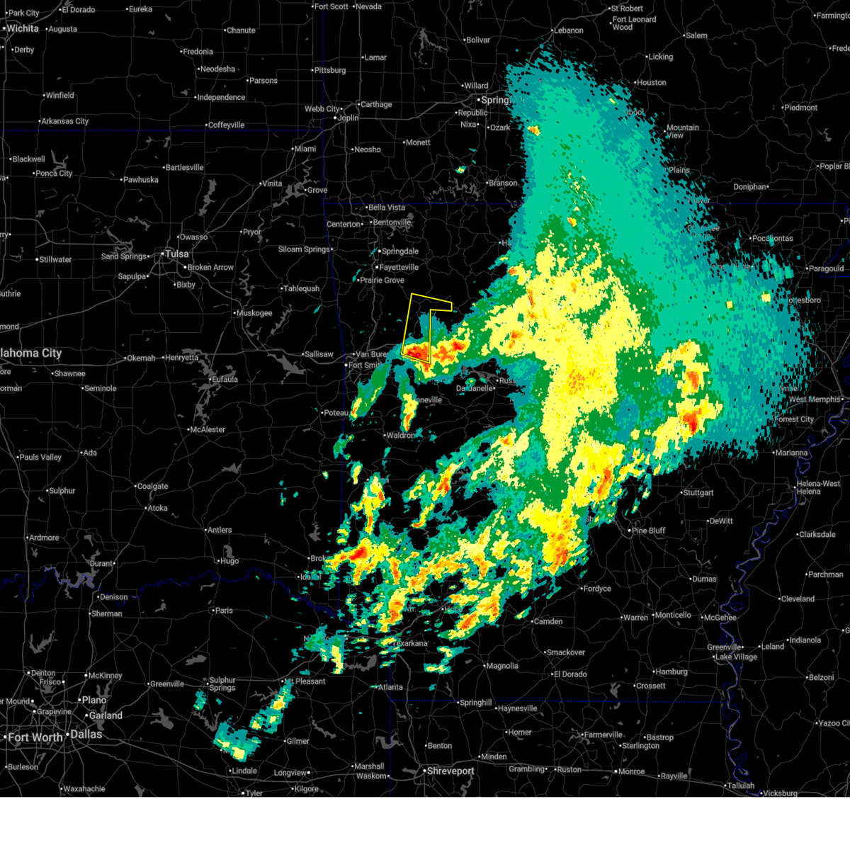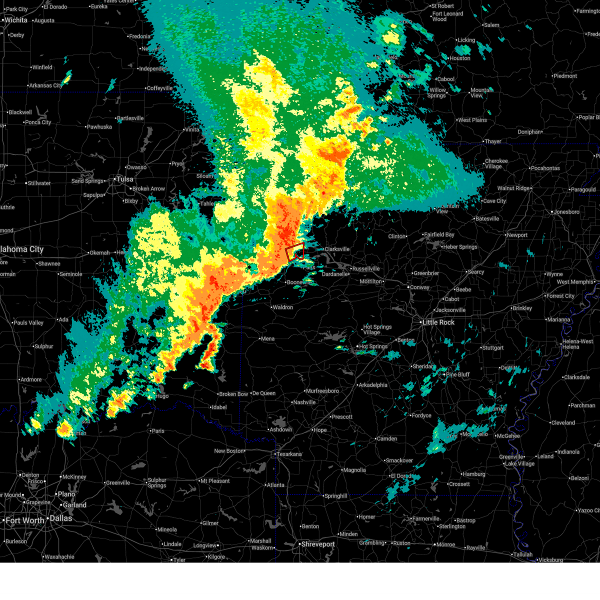 At 109 am cst, severe thunderstorms were located along a line extending from 4 miles southwest of saint paul to 3 miles north of charleston to 2 miles southwest of hackett, moving east at 40 mph (radar indicated). Hazards include 70 mph wind gusts and quarter size hail. Hail damage to vehicles is expected. expect considerable tree damage. wind damage is also likely to mobile homes, roofs, and outbuildings. locations in or near the path include, ozark, charleston, greenwood, lavaca, mulberry, hackett, altus, branch, denning, st. paul, wiederkehr village, cass, saint paul, excelsior, boston, bloomer, pettigrew, washburn, burnville, fort chaffee, this includes interstate 40 in arkansas between mile markers 21 and 42. a tornado watch remains in effect until 400 am cst for northwestern arkansas. A tornado watch also remains in effect until 600 am cst for northwestern and west central arkansas.