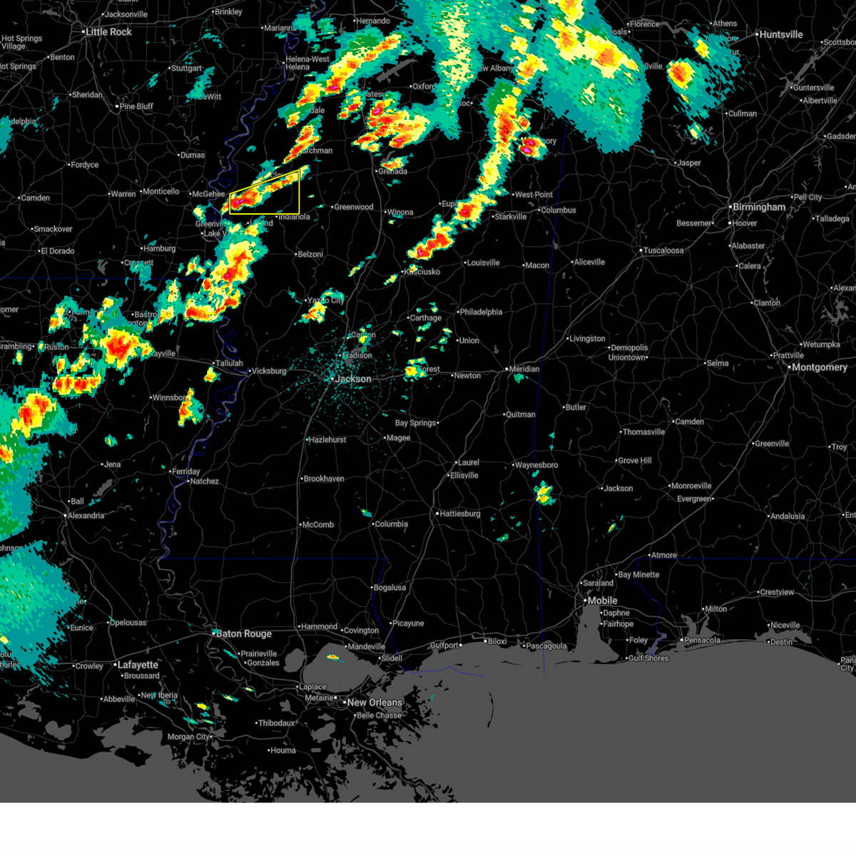 At 805 pm cdt, severe thunderstorms were located along a line extending from 7 miles southwest of crumrod to near mcmillan corner, moving east at 40 mph (radar indicated). Hazards include 70 mph wind gusts. Expect considerable tree damage. damage is likely to mobile homes, roofs, and outbuildings. severe thunderstorms will be near, deeson around 820 pm cdt. greenville, shelby and metcalfe around 825 pm cdt. leland around 835 pm cdt. tribbett, holly ridge and rome around 840 pm cdt. indianola and inverness around 845 pm cdt. Other locations impacted by these severe thunderstorms include pace, duncan, alligator, winstonville, arcola, merigold, doddsville and beulah.