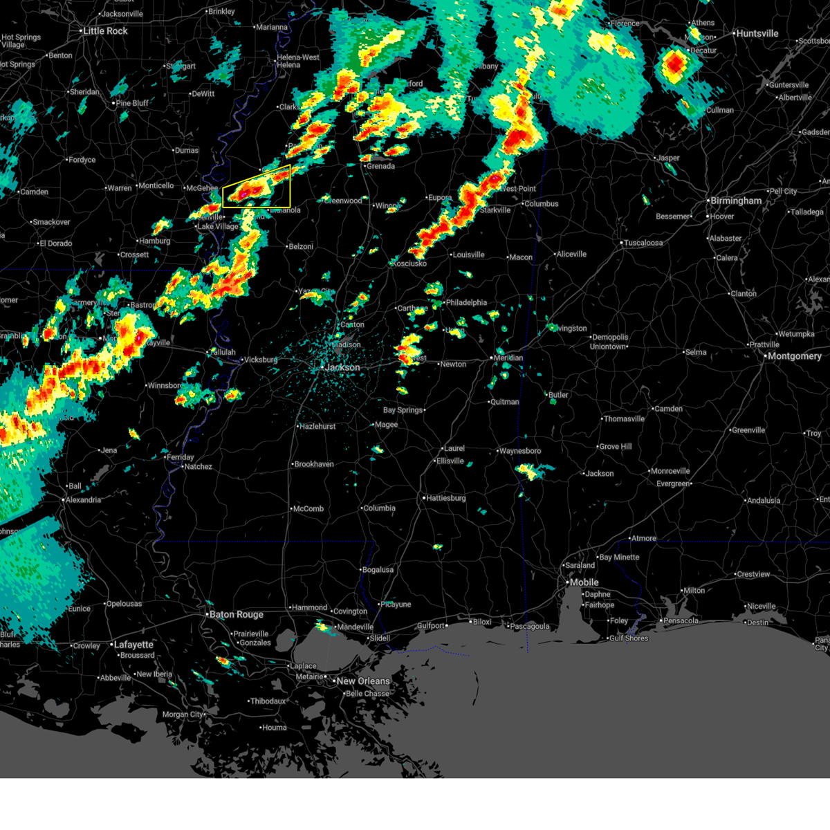 At 1129 pm cdt, a severe thunderstorm was located over tribbett, or near leland, moving northeast at 40 mph (radar indicated). Hazards include 70 mph wind gusts. Expect considerable tree damage. damage is likely to mobile homes, roofs, and outbuildings. this severe thunderstorm will be near, holly ridge around 1140 pm cdt. indianola around 1145 pm cdt. sunflower around 1200 am cdt. blaine around 1205 am cdt. ruleville around 1210 am cdt. other locations impacted by this severe thunderstorm include doddsville. A tornado watch remains in effect until 600 am cdt for central, north central and northwestern mississippi.