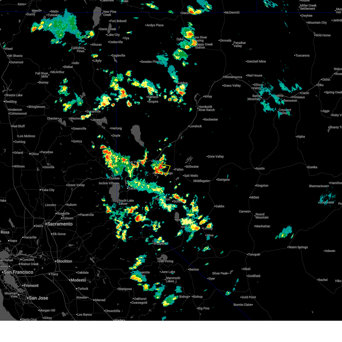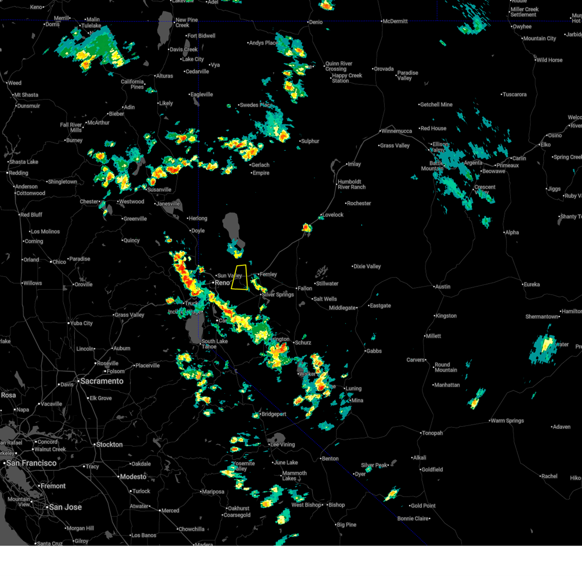 The national weather service in reno has issued a * severe thunderstorm warning for. storey county in western nevada. southern washoe county in western nevada. north central lyon county in west central nevada. Until 800 pm pdt.