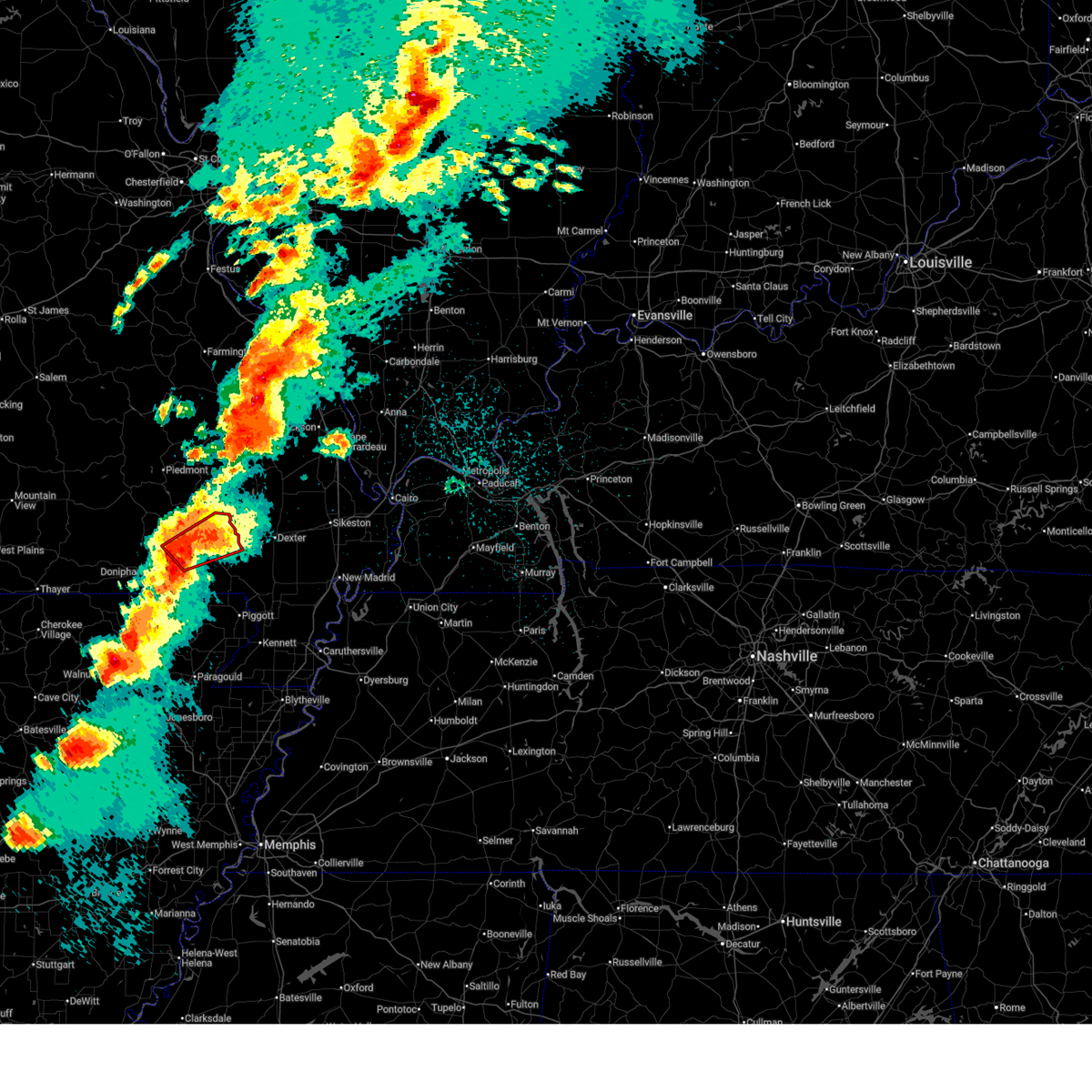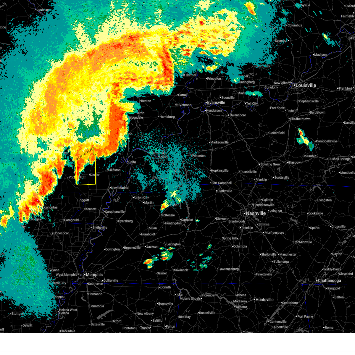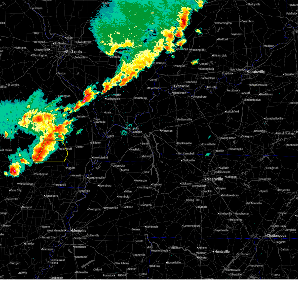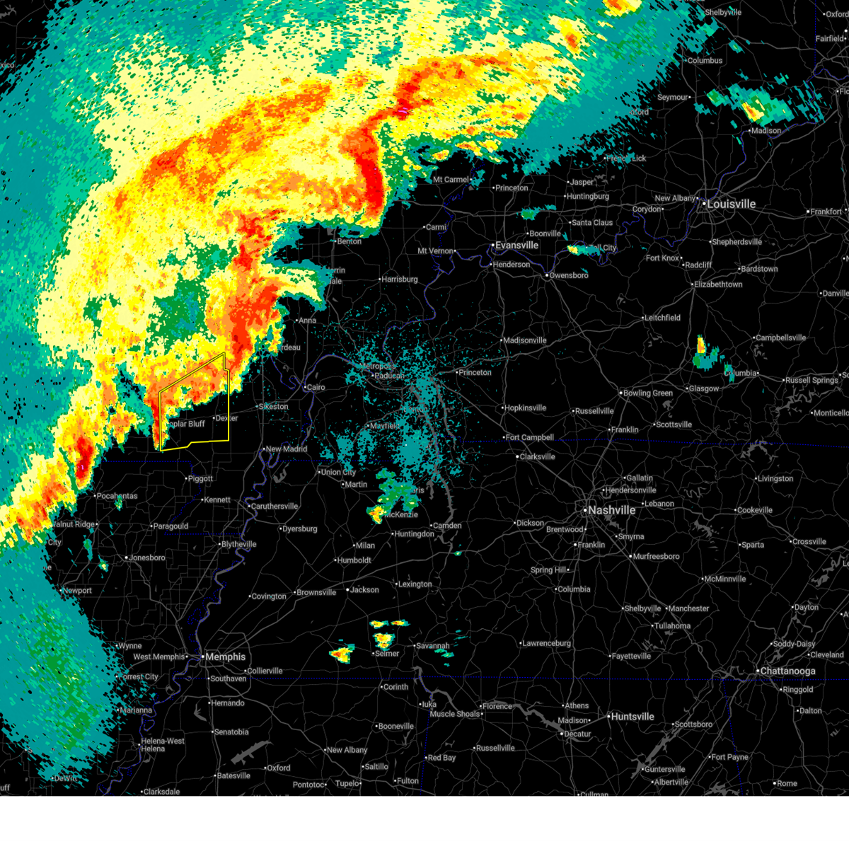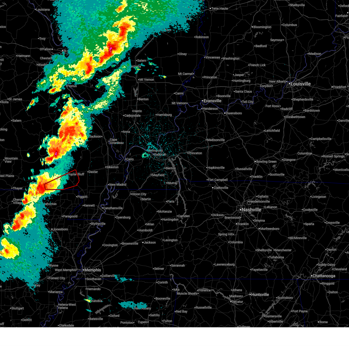 At 1128 pm cdt, a confirmed large and extremely dangerous tornado was located near milltown, or 7 miles west of poplar bluff, moving northeast at 50 mph. poplar bluff should take cover immediately! this is a particularly dangerous situation. take cover now! (weather spotters confirmed tornado). Hazards include damaging tornado. You are in a life-threatening situation. flying debris may be deadly to those caught without shelter. mobile homes will be destroyed. considerable damage to homes, businesses, and vehicles is likely and complete destruction is possible. the tornado will be near, poplar bluff around 1135 pm cdt. fisk around 1145 pm cdt. Other locations impacted by this tornadic thunderstorm include rombauer.