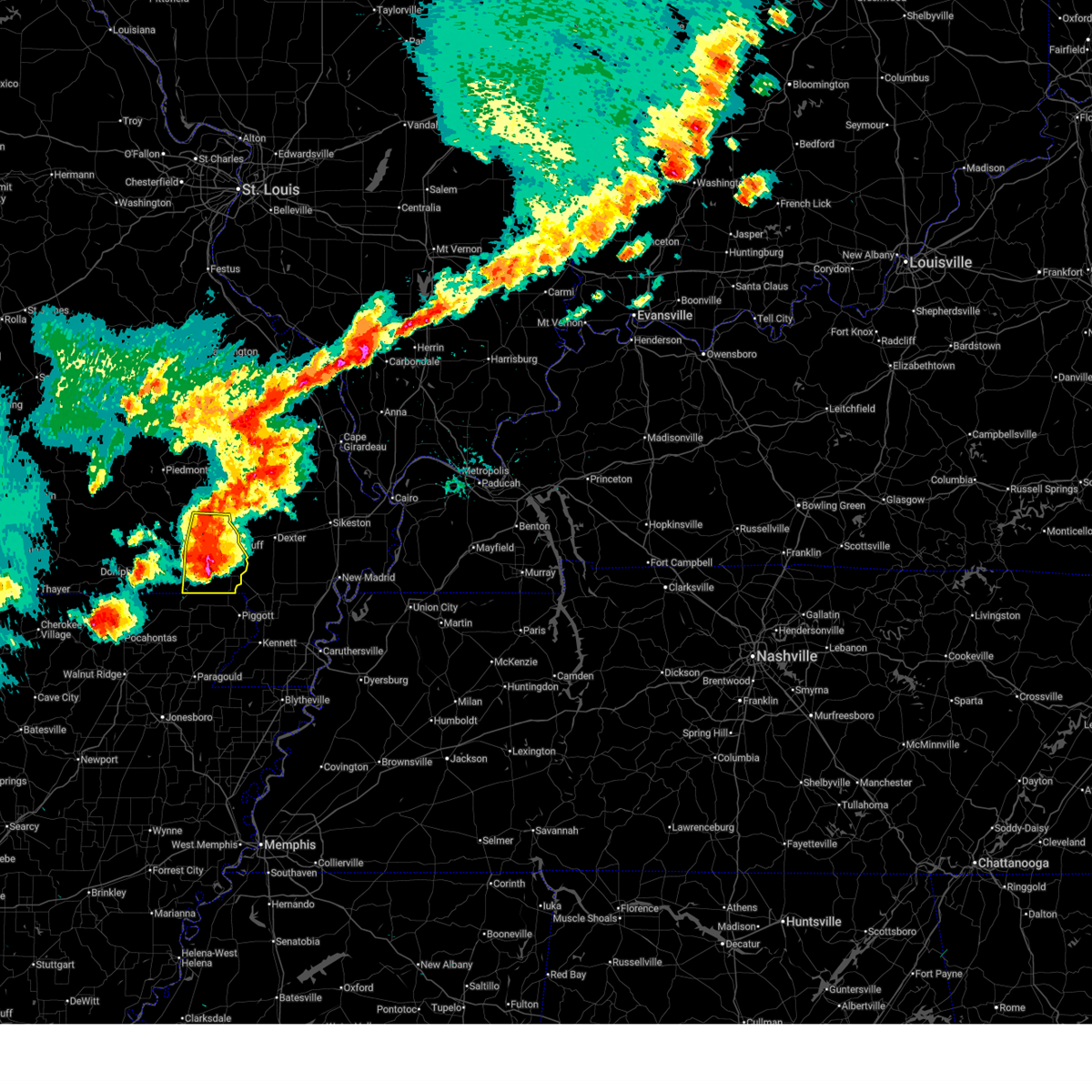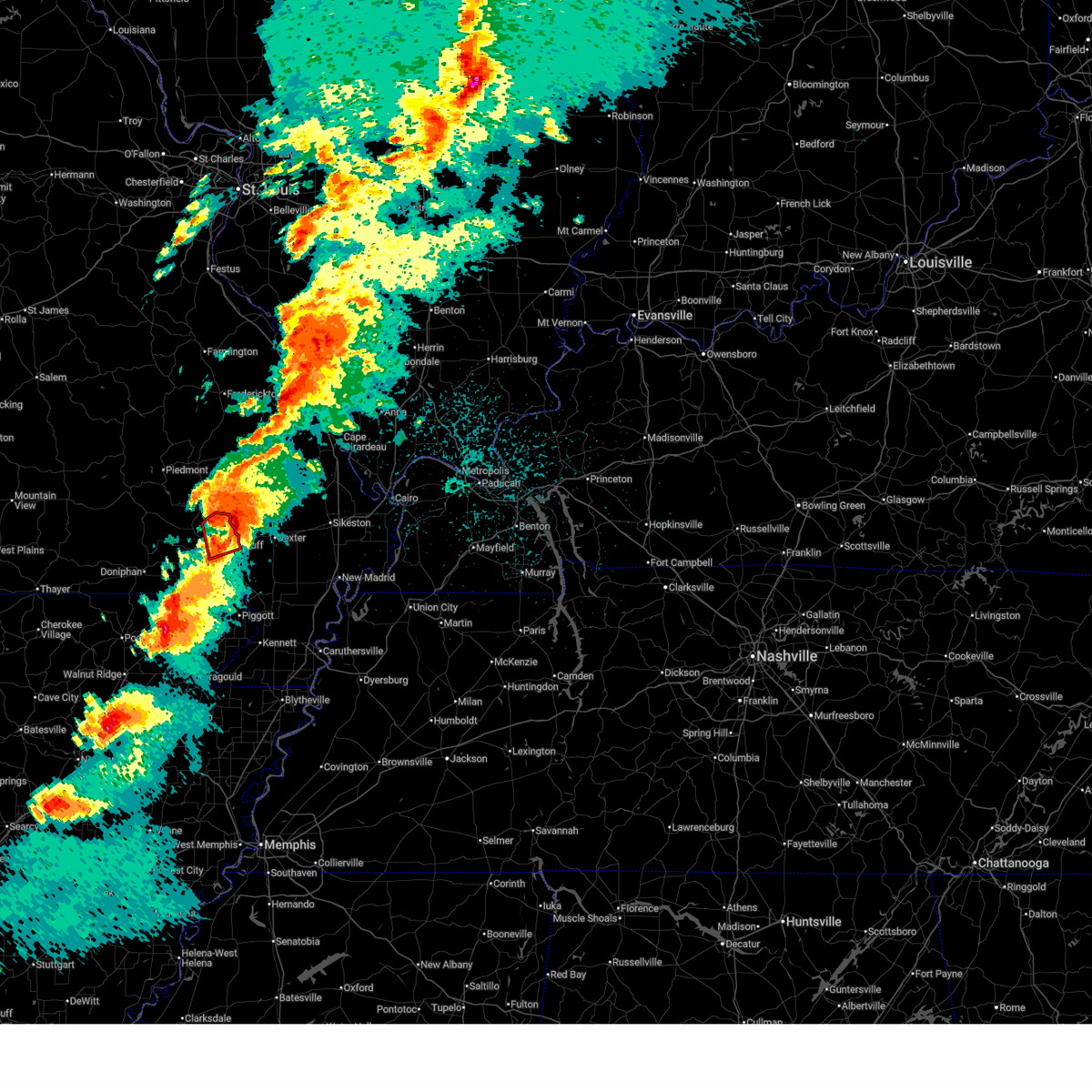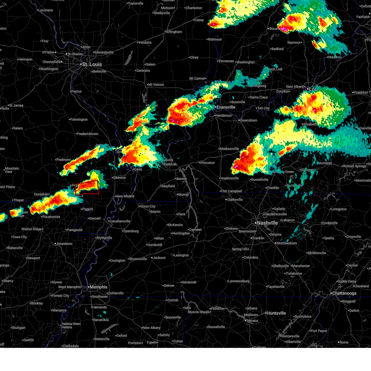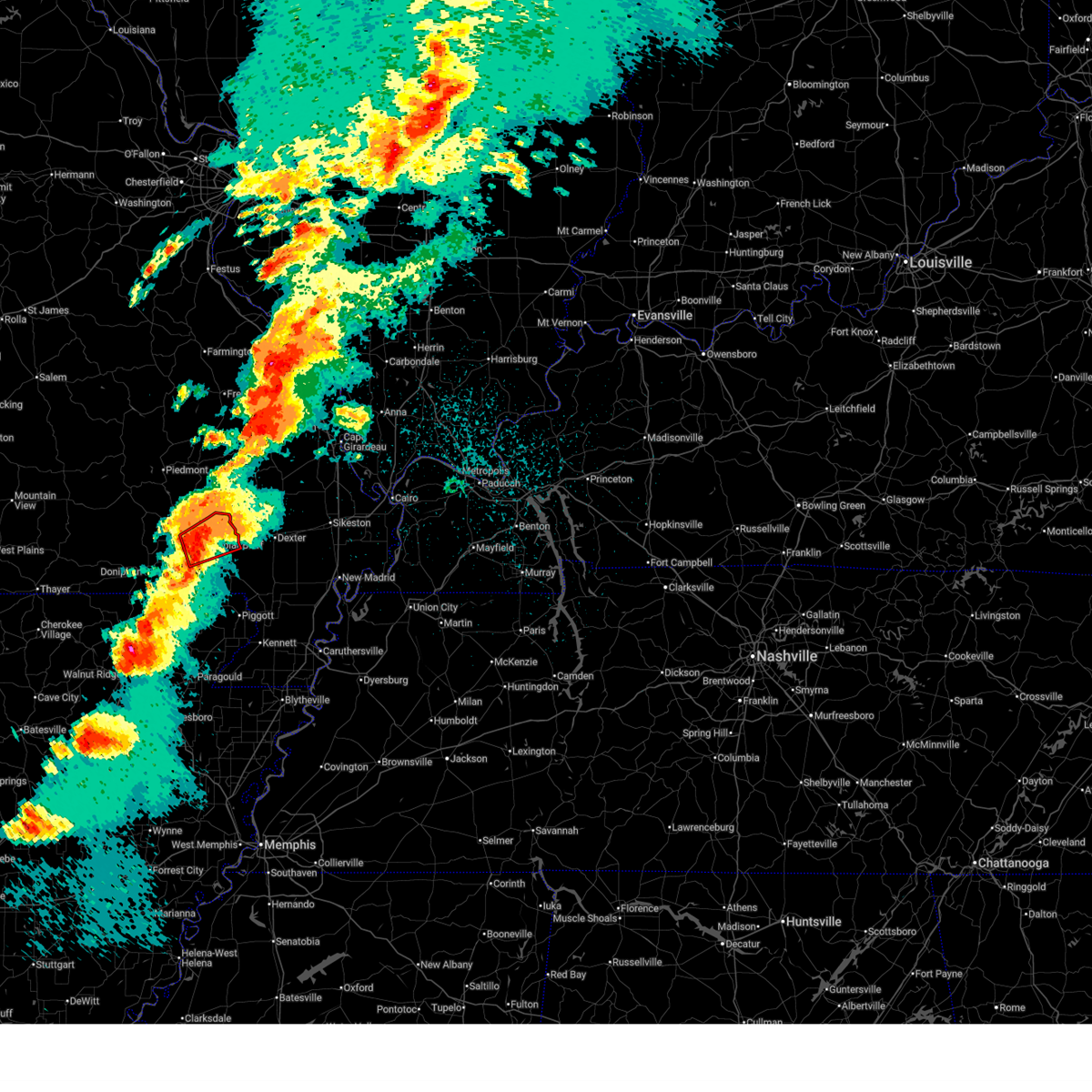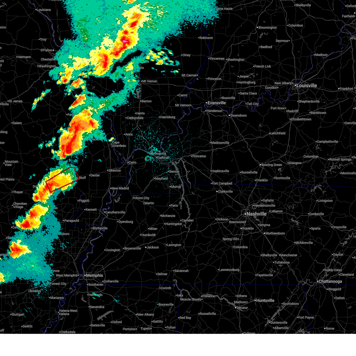 At 1128 pm cdt, a confirmed large and extremely dangerous tornado was located near milltown, or 7 miles west of poplar bluff, moving northeast at 50 mph. poplar bluff should take cover immediately! this is a particularly dangerous situation. take cover now! (weather spotters confirmed tornado). Hazards include damaging tornado. You are in a life-threatening situation. flying debris may be deadly to those caught without shelter. mobile homes will be destroyed. considerable damage to homes, businesses, and vehicles is likely and complete destruction is possible. the tornado will be near, poplar bluff around 1135 pm cdt. fisk around 1145 pm cdt. Other locations impacted by this tornadic thunderstorm include rombauer.