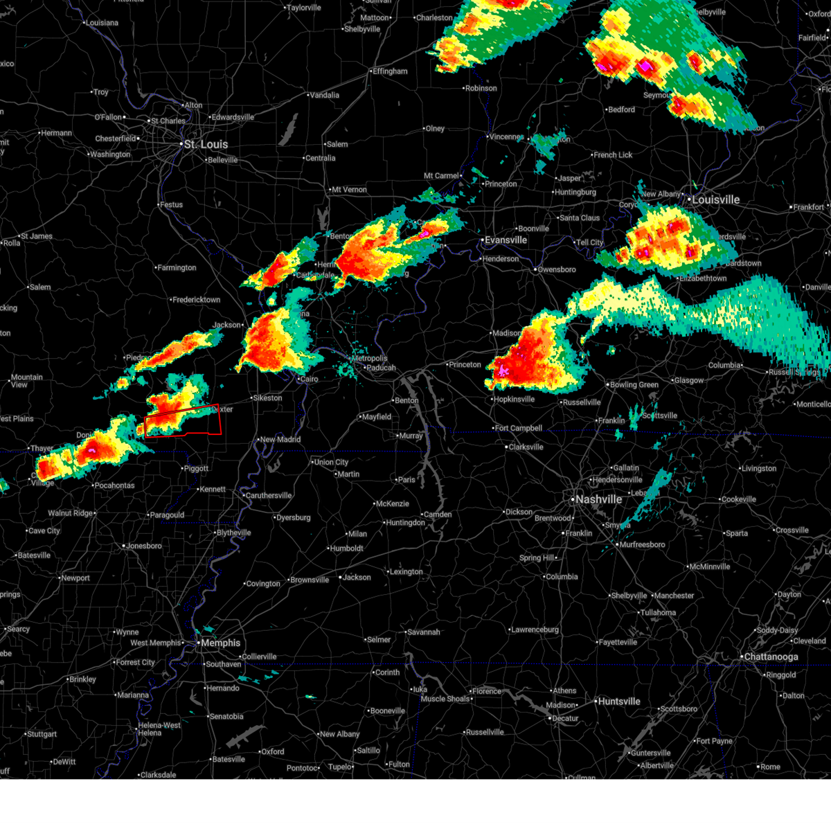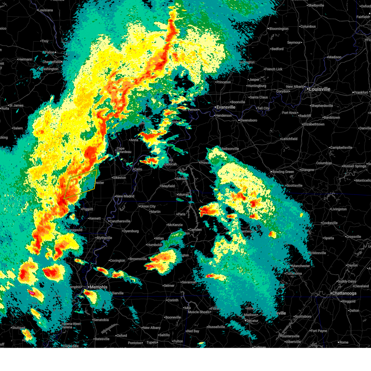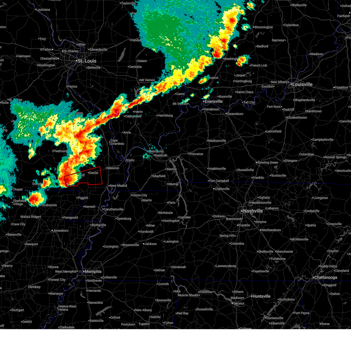 At 535 pm cdt, a severe thunderstorm capable of producing a tornado was located near dudley, or 8 miles west of bernie, moving east at 55 mph (radar indicated rotation). Hazards include tornado and quarter size hail. Flying debris will be dangerous to those caught without shelter. mobile homes will be damaged or destroyed. damage to roofs, windows, and vehicles will occur. tree damage is likely. this dangerous storm will be near, dudley, bernie, and dexter around 540 pm cdt. parma around 545 pm cdt. essex around 550 pm cdt. Other locations impacted by this tornadic thunderstorm include catron, baker, and penermon.