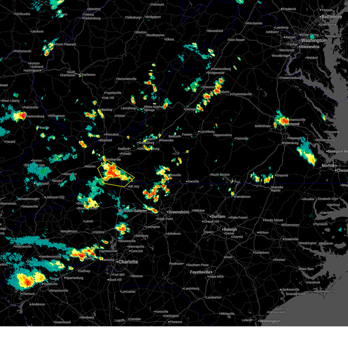 At 908 pm edt, severe thunderstorms were located along a line extending from near wytheville to favonia to near nebo, moving southeast at 40 mph (radar indicated). Hazards include 60 mph wind gusts and quarter size hail. Minor damage to vehicles is possible. Expect wind damage to trees and power lines.