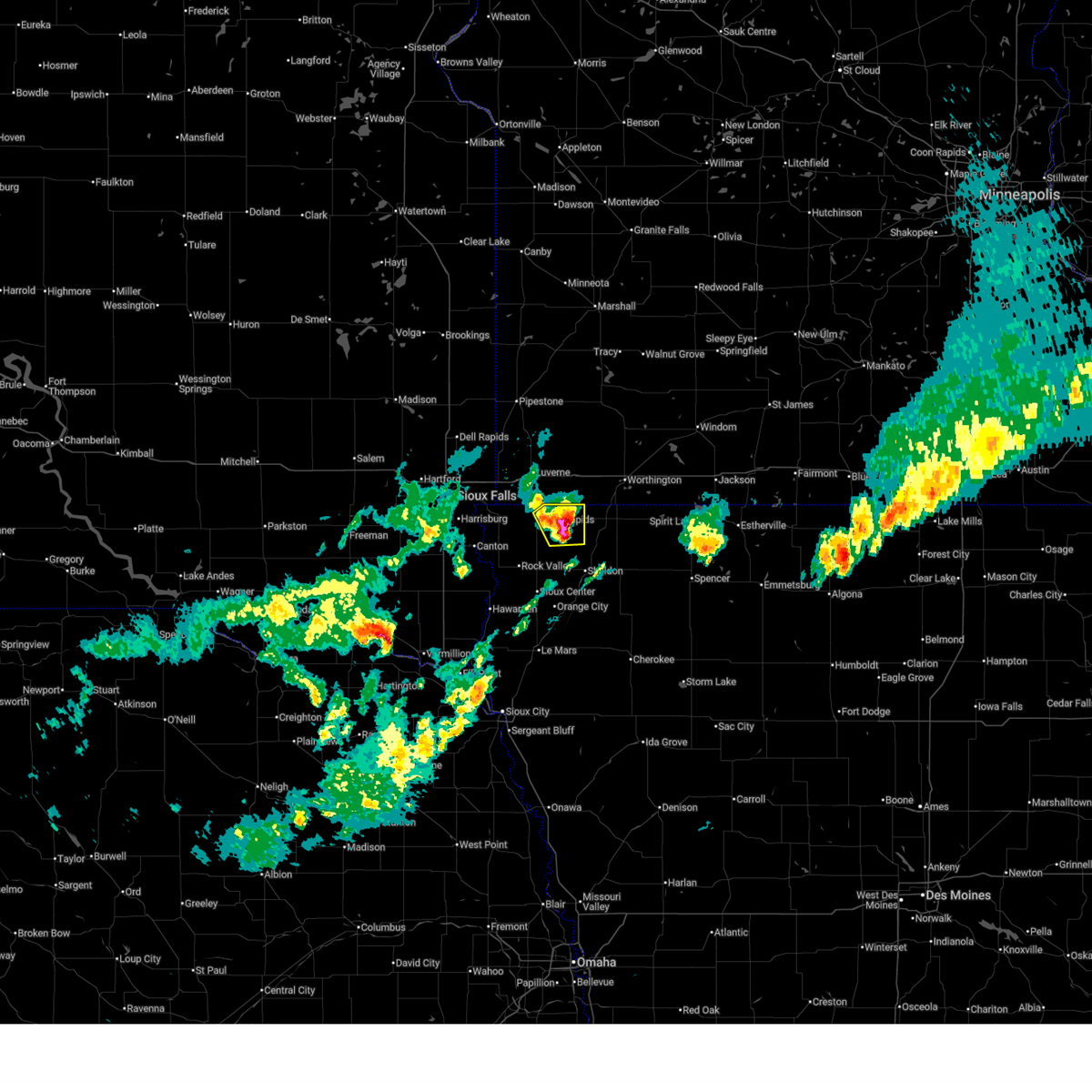 At 913 pm cdt, a severe thunderstorm was located near harrisburg, or near sioux falls, moving northeast at 55 mph (radar indicated). Hazards include 70 mph wind gusts and nickel size hail. Expect considerable tree damage. damage is likely to mobile homes, roofs, and outbuildings. this severe thunderstorm will be near, rowena around 920 pm cdt. brandon and larchwood around 925 pm cdt. valley springs and hills around 930 pm cdt. beaver creek around 935 pm cdt. luverne and blue mounds state park around 945 pm cdt. hardwick around 950 pm cdt. other locations impacted by this severe thunderstorm include magnolia, kenneth and steen. A tornado watch remains in effect until 200 am cdt for northwestern iowa, southwestern minnesota, and southeastern south dakota.