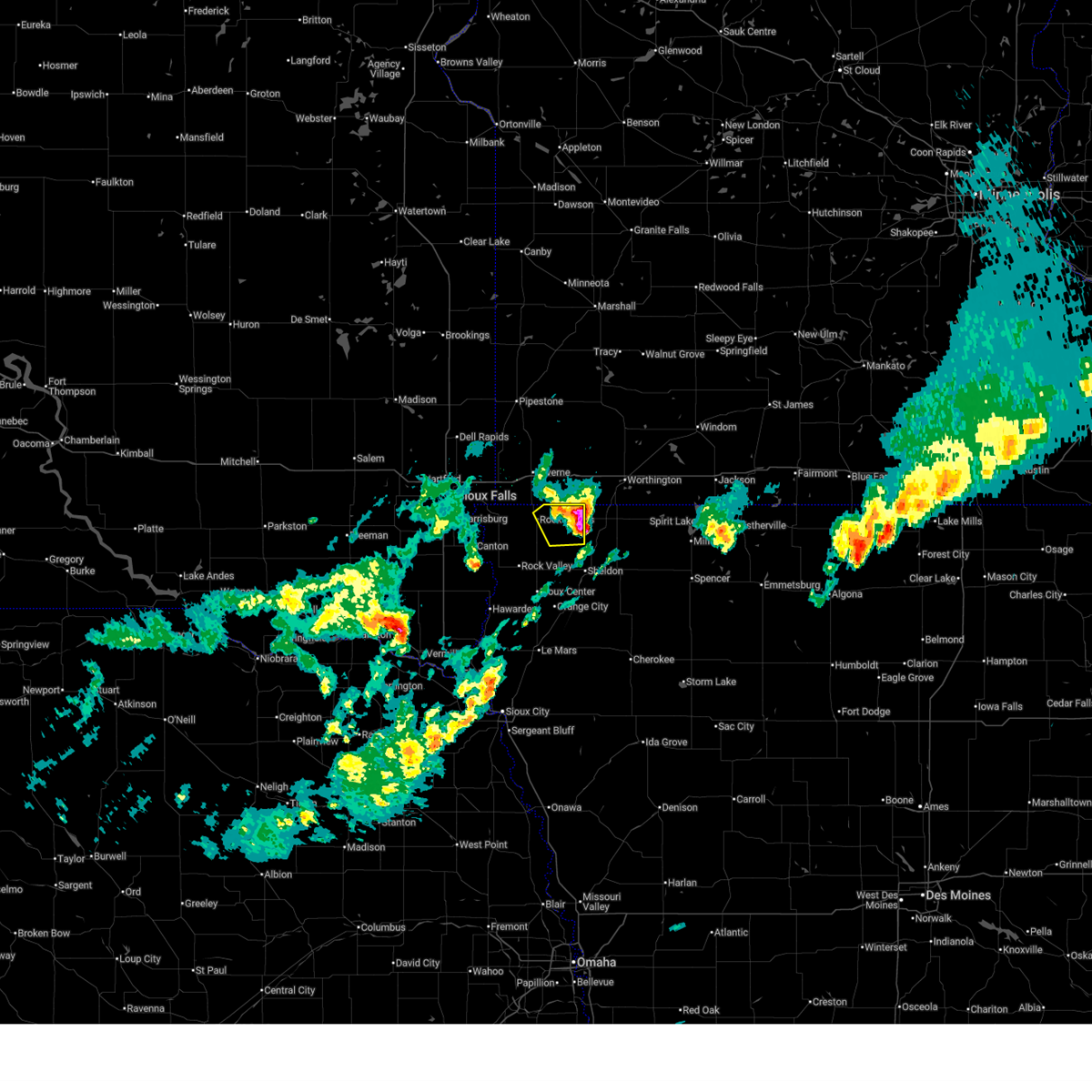 Svrfsd the national weather service in sioux falls has issued a * severe thunderstorm warning for, cherokee county in northwestern iowa, lyon county in northwestern iowa, osceola county in northwestern iowa, sioux county in northwestern iowa, northern plymouth county in northwestern iowa, o'brien county in northwestern iowa, * until 1000 pm cdt. * at 922 pm cdt, severe thunderstorms were located along a line extending from hills to near hudson to near sioux center to near craig to 9 miles northwest of merrill, moving east at 65 mph. these are destructive storms for lester, to sioux center, to le mars, iowa! (radar indicated). Hazards include 80 mph wind gusts and penny size hail. Flying debris will be dangerous to those caught without shelter. mobile homes will be heavily damaged. expect considerable damage to roofs, windows, and vehicles. extensive tree damage and power outages are likely. severe thunderstorms will be near, le mars, sioux center, orange city, rock rapids, rock valley, doon, lester, maurice, alvord, and craig around 925 pm cdt. hull and alton around 930 pm cdt. remsen, george, boyden, hospers, and granville around 935 pm cdt. sheldon, marcus, little rock, and matlock around 940 pm cdt. Other locations in the path of these severe thunderstorms include sibley, paullina, ashton, cleghorn, archer, sanborn, primghar, cherokee, sutherland, ocheyedan, melvin and larrabee.