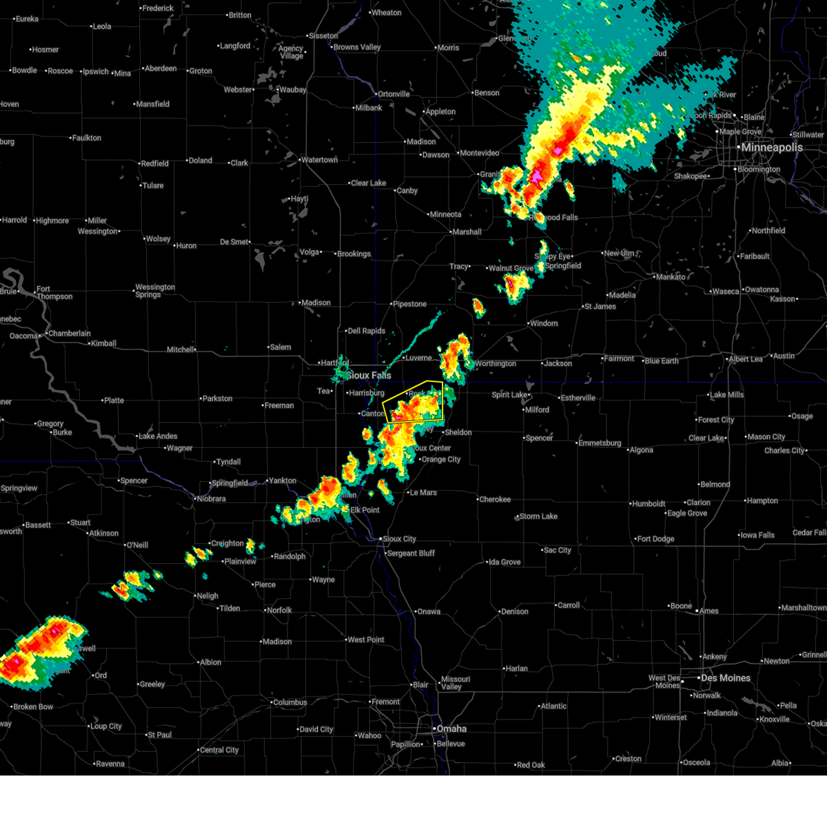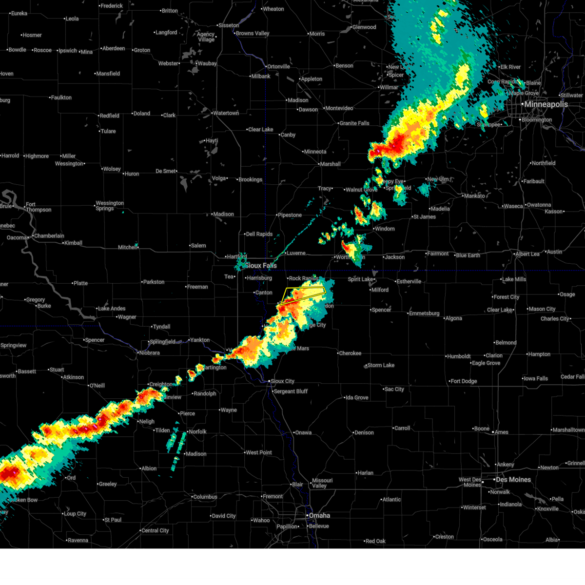 At 421 am cdt, severe thunderstorms were located along a line extending from near sherman to near rowena to near beresford, moving east at 60 mph (radar indicated). Hazards include 70 mph wind gusts. Expect considerable tree damage. damage is likely to mobile homes, roofs, and outbuildings. severe thunderstorms will be near, garretson, valley springs, sherman and rowena around 425 am cdt. canton, larchwood and beaver creek around 430 am cdt. luverne, inwood, hills, lester, fairview, blue mounds state park and newton hills state park around 435 am cdt. hudson and alvord around 440 am cdt. other locations in the path of these severe thunderstorms include rock rapids, rock valley, doon, adrian, ellsworth, sioux center, hull, george, boyden, rushmore, maurice, worthington, orange city, sibley, alton, little rock and matlock. thunderstorm damage threat, considerable hail threat, radar indicated max hail size, <. 75 in wind threat, observed max wind gust, 70 mph.