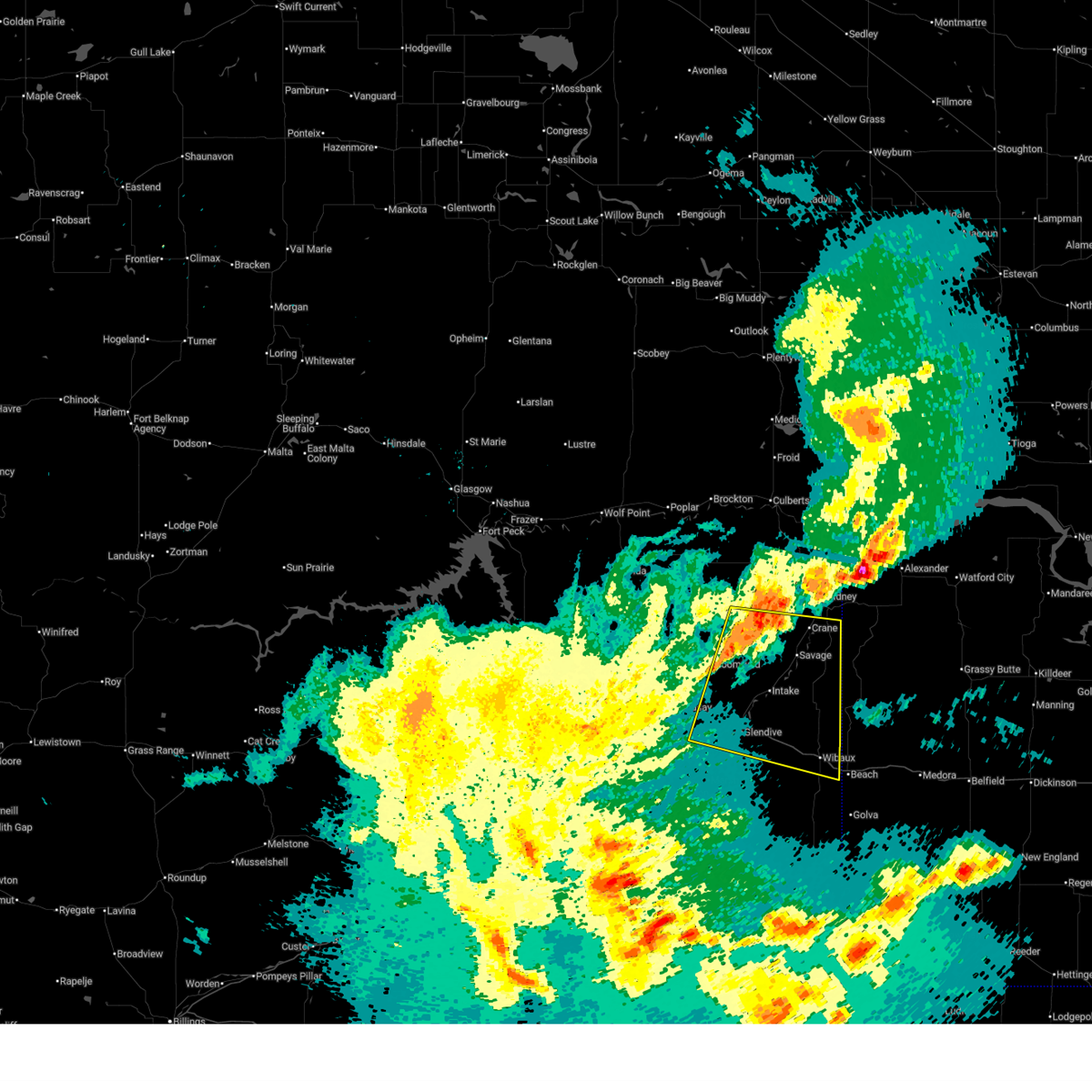 Svrggw the national weather service in glasgow has issued a * severe thunderstorm warning for, northeastern wibaux county in northeastern montana, southeastern dawson county in northeastern montana, southeastern richland county in northeastern montana, * until 515 am mdt. * at 411 am mdt, a severe thunderstorm was located over intake, or 13 miles northeast of glendive, moving east at 40 mph (radar indicated). Hazards include golf ball size hail and 60 mph wind gusts. People and animals outdoors will be injured. expect hail damage to roofs, siding, windows, and vehicles. Expect wind damage to roofs, siding, and trees.