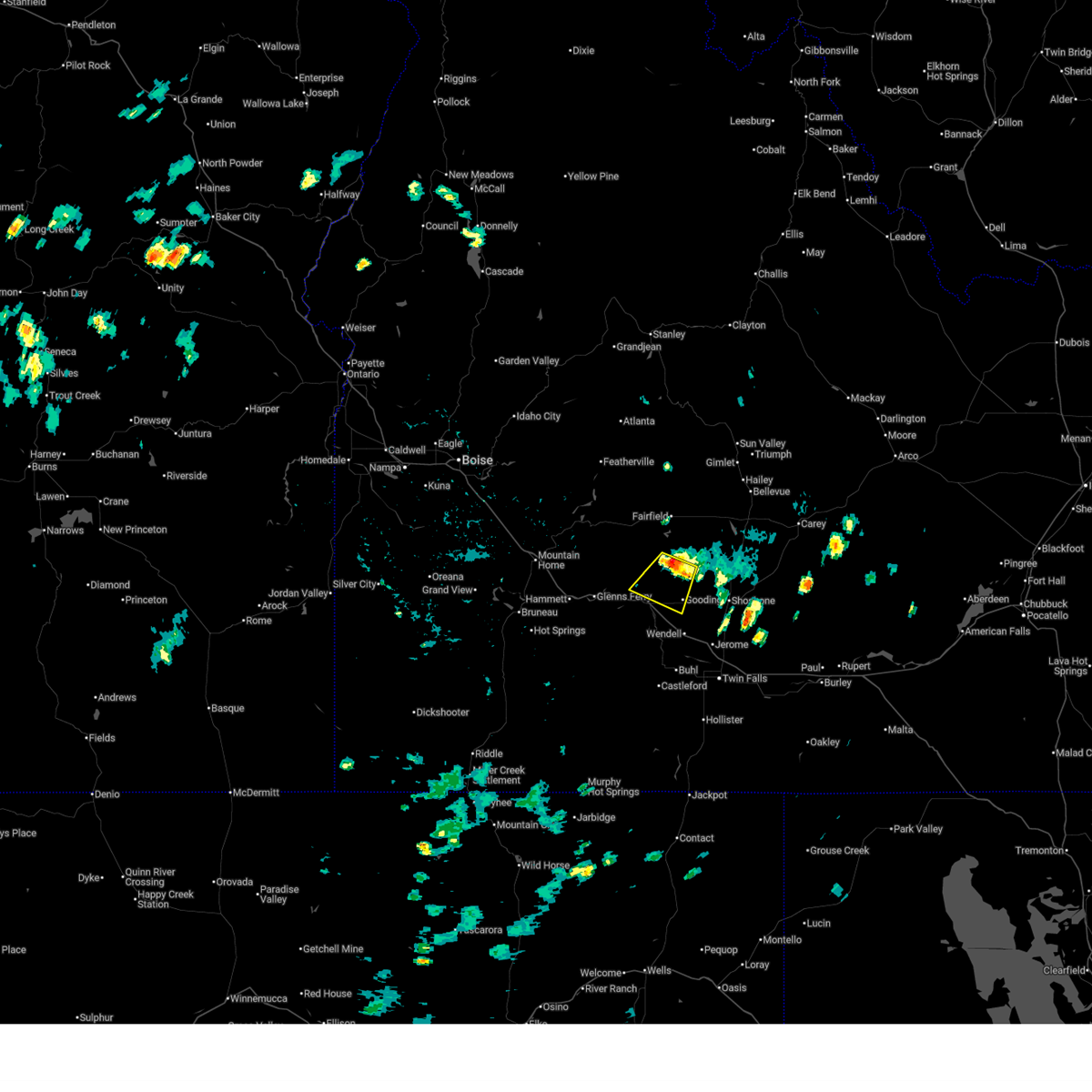 Svrboi the national weather service in boise has issued a * severe thunderstorm warning for, jerome county in south central idaho, northwestern twin falls county in south central idaho, southeastern elmore county in southwestern idaho, east central owyhee county in southwestern idaho, gooding county in south central idaho, * until 915 am mst. * at 832 am mst, severe thunderstorms were located along a line extending from near white arrow hot spring to near glenns ferry to bruneau sand dunes, moving east at 55 mph (radar indicated). Hazards include 70 mph wind gusts and penny size hail. Expect considerable tree damage. damage is likely to mobile homes, roofs, and outbuildings. severe thunderstorms will be near, bliss, deadman flat, and twentymile butte around 840 am mst. gooding and hagerman around 850 am mst. wendell around 900 am mst. Jerome around 910 am mst.