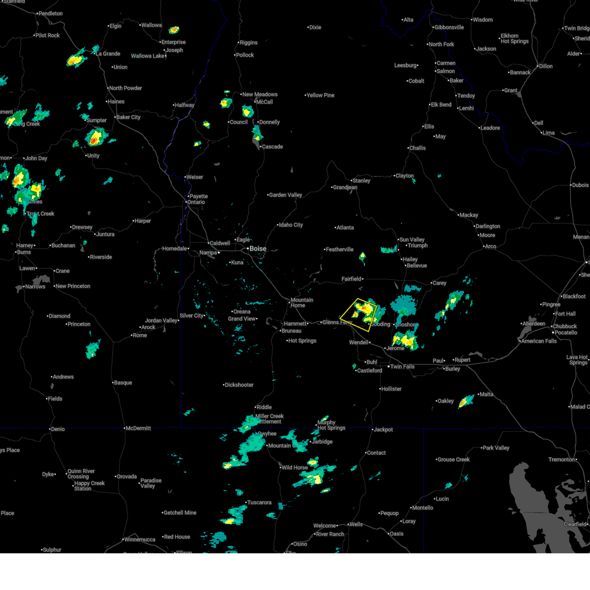 At 721 pm mdt, a severe thunderstorm was located near twentymile butte, or 17 miles southeast of glenns ferry, moving northeast at 35 mph (radar indicated). Hazards include two inch hail and 60 mph wind gusts. People and animals outdoors will be injured. expect hail damage to roofs, siding, windows, and vehicles. expect wind damage to roofs, siding, and trees. this severe thunderstorm will be near, hagerman and bliss around 740 pm mdt. wendell around 750 pm mdt. Gooding around 800 pm mdt.