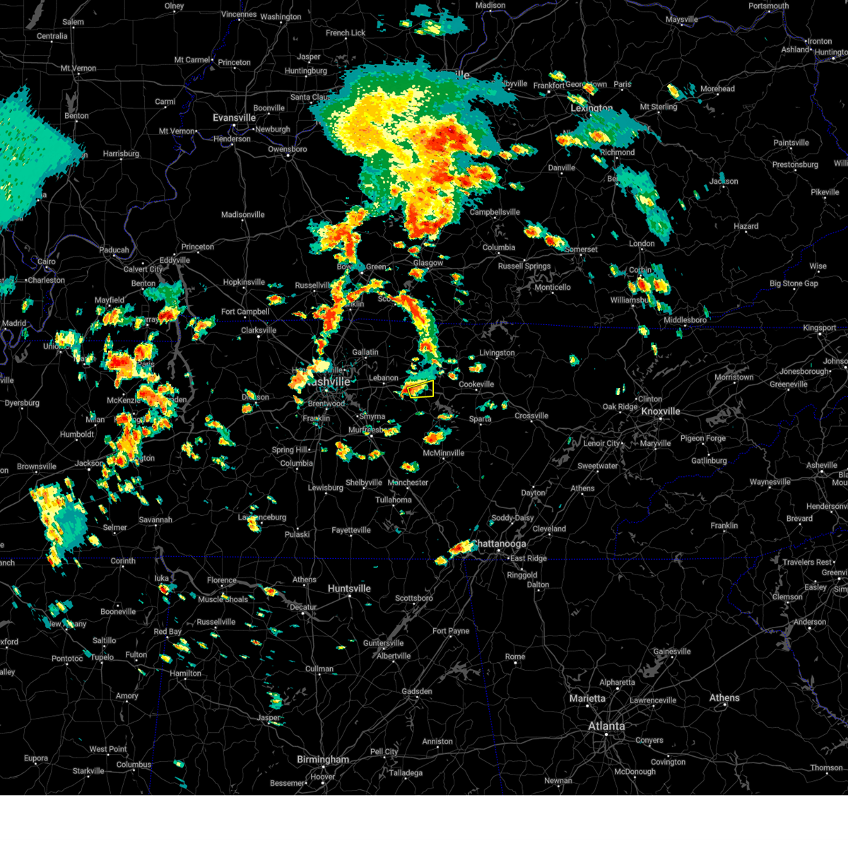 At 727 am cst, a severe thunderstorm capable of producing a tornado was located near rural hill, or 9 miles southwest of lebanon, moving east at 65 mph (radar indicated rotation). Hazards include tornado. Flying debris will be dangerous to those caught without shelter. mobile homes will be damaged or destroyed. damage to roofs, windows, and vehicles will occur. tree damage is likely. this dangerous storm will be near, watertown around 740 am cst. gordonsville around 755 am cst. Other locations impacted by this tornadic thunderstorm include cedars of lebanon state park, tuckers crossroads, hickman, gladeville and alexandria.
