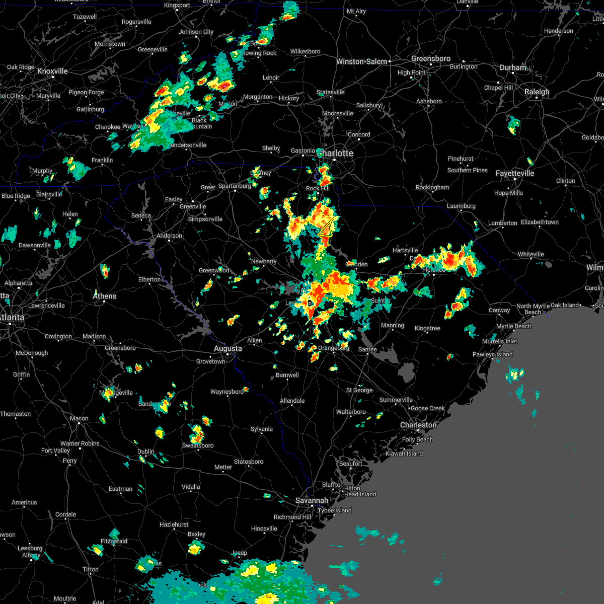 At 919 am est, severe thunderstorms were located along a line extending from 9 miles east of gastonia to 6 miles southwest of uptown charlotte to 8 miles northwest of lancaster, moving northeast at 60 mph (radar indicated). Hazards include 60 mph wind gusts. Expect damage to trees and power lines. Locations impacted include, fort mill, tega cay, lesslie, great falls, fort lawn, catawba, carowinds, fishing creek reservoir, rock hill, and lake wylie.
