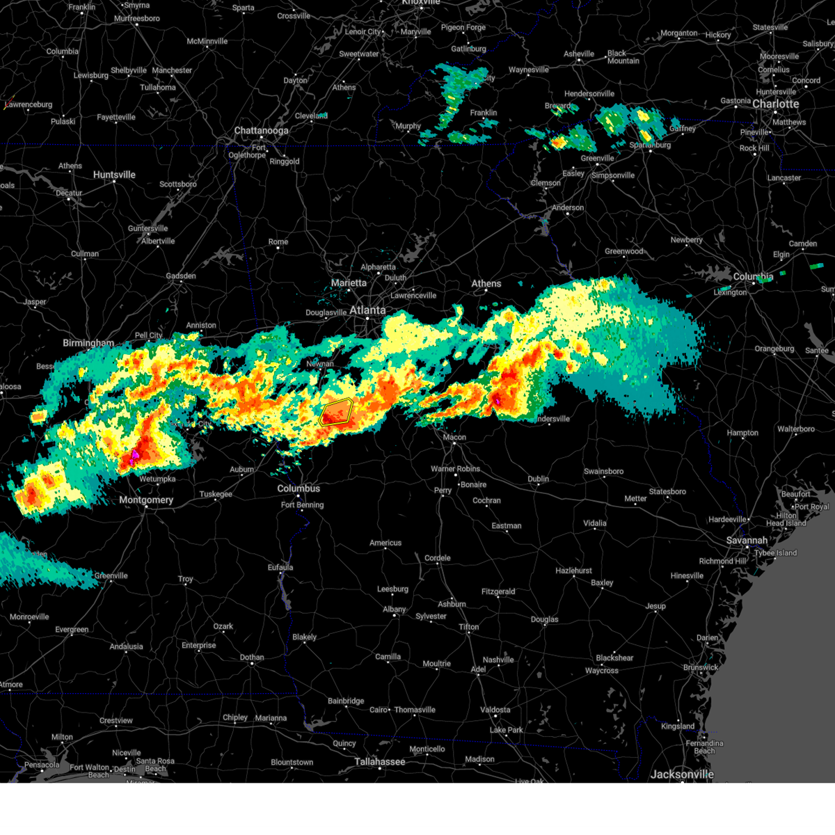 At 1226 am edt, severe thunderstorms were located along a line extending from near senoia to near pine mountain, moving east at 50 mph (radar indicated). Hazards include 60 mph wind gusts and quarter size hail. Hail damage to vehicles is expected. expect wind damage to roofs, siding, and trees. Other locations in the warning include but are not limited to griffin, zebulon, greenville, peachtree city, manchester, senoia, pine mountain, woodbury, luthersville, brooks, warm springs, molena, williamson, sharpsburg, turin, orchard hill, meansville, haralson, sunny side and gay.