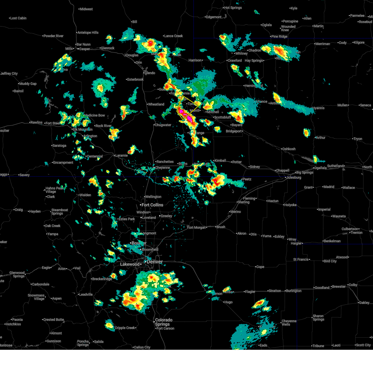 At 331 pm mdt, a severe thunderstorm capable of producing a tornado was located over lyman, or 9 miles southeast of torrington, and is nearly stationary (radar indicated rotation. numerous landspout and funnel reports). Hazards include tornado and quarter size hail. Flying debris will be dangerous to those caught without shelter. mobile homes will be damaged or destroyed. damage to roofs, windows, and vehicles will occur. tree damage is likely. Locations impacted include, morrill, lyman, huntley, and henry.