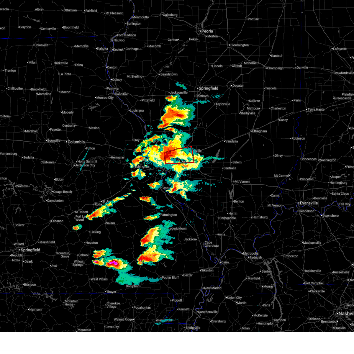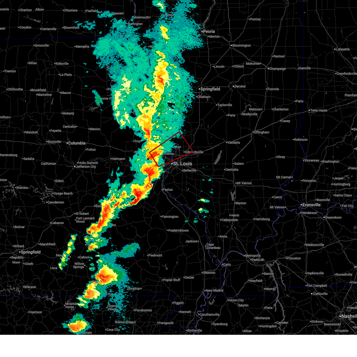 At 245 pm cdt, a confirmed and extremely dangerous tornado was located over st. louis, moving east at 50 mph. this is a particularly dangerous situation. take cover now! (radar confirmed tornado). Hazards include damaging tornado. You are in a life-threatening situation. flying debris may be deadly to those caught without shelter. mobile homes will be destroyed. considerable damage to homes, businesses, and vehicles is likely and complete destruction is possible. locations impacted include, st. louis, florissant, university city, granite city, o'fallon, east st. louis, hazelwood, collinsville, edwardsville, webster groves, ferguson, fairview heights, overland, clayton, jennings, glen carbon, bellefontaine neighbors, troy, berkeley and richmond heights. this includes the following state parks, scott joplin historic site and horseshoe lake state park. this includes the following highways, interstate 64 in illinois near exit 9. interstate 55 in illinois near exit 23. Interstate 70 in illinois near exit 21.