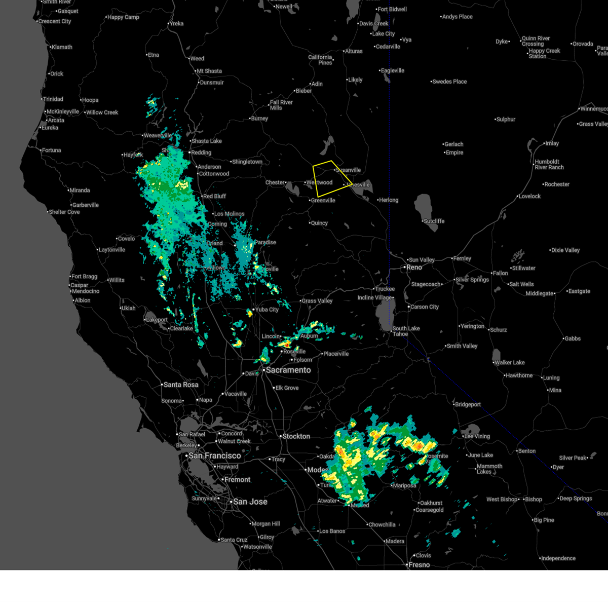 The national weather service in reno has issued a * severe thunderstorm warning for. central lassen county in northern california. until 530 pm pdt. At 436 pm pdt, a severe thunderstorm was located over susanville, or 4 miles east of the hog fire, and is nearly stationary.