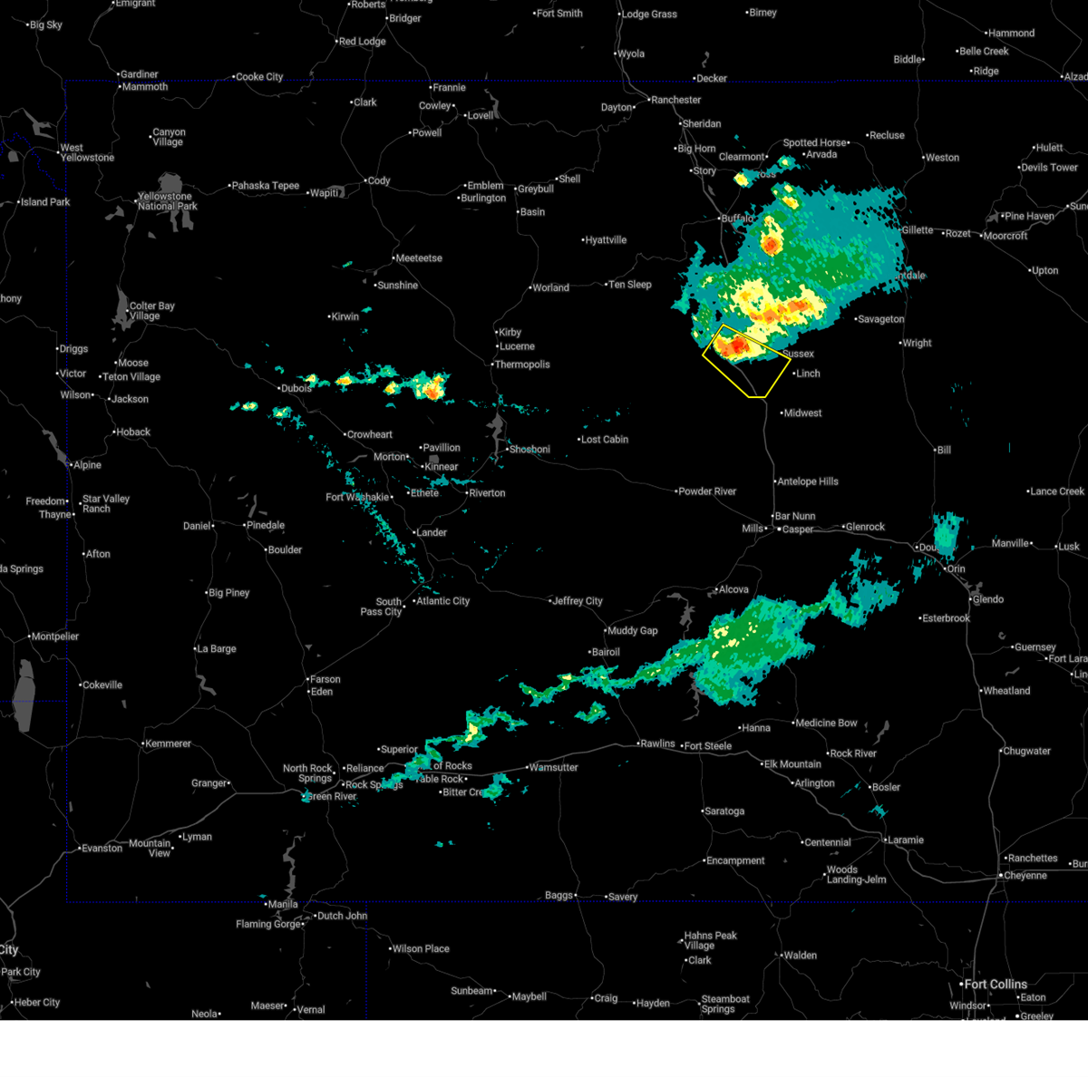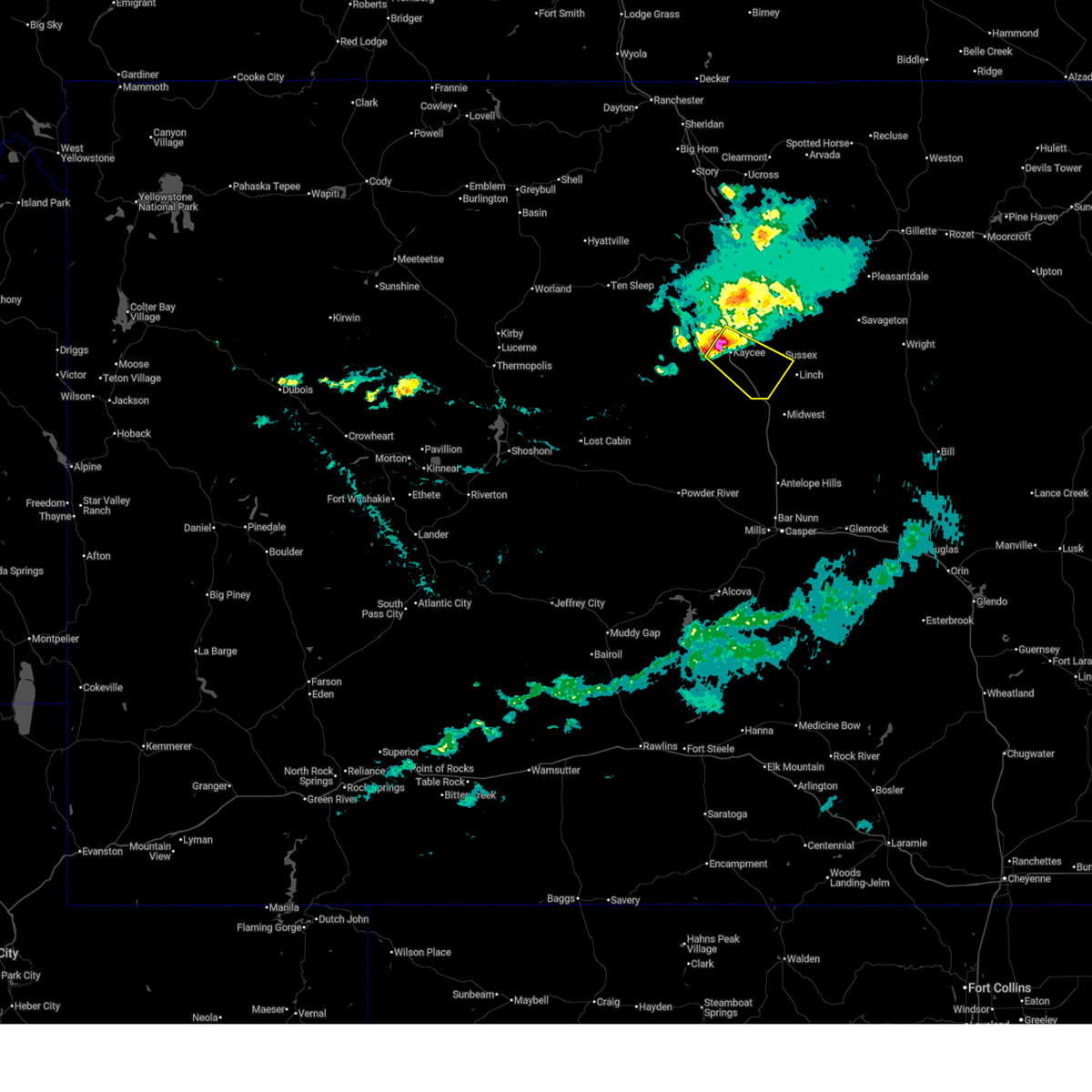 At 630 pm mdt, a severe thunderstorm was located over kaycee, moving east at 35 mph (radar indicated). Hazards include ping pong ball size hail and 60 mph wind gusts. People and animals outdoors will be injured. expect hail damage to roofs, siding, windows, and vehicles. expect wind damage to roofs, siding, and trees. this severe storm will be near, fort reno historical site around 700 pm mdt. other locations impacted by this severe thunderstorm include sussex. This includes interstate 25 between mile markers 248 and 263.